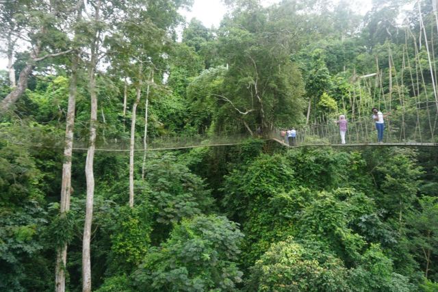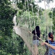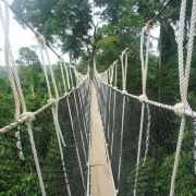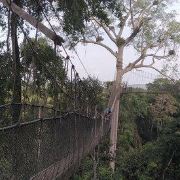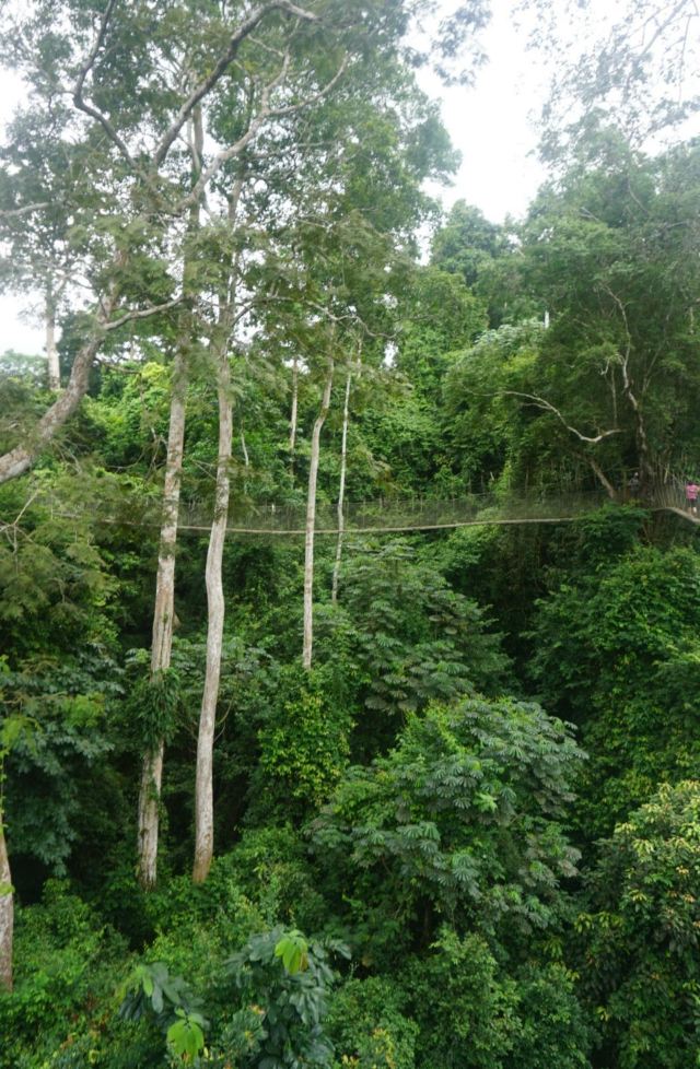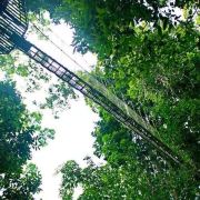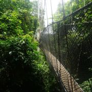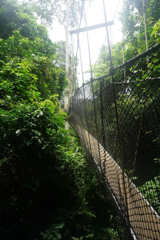 为了对该地区的雨林进行有效保护,而又方便游客参观,二十世纪90年代中期,这个公园建造了一个131英尺高的空中树冠通道。这个悬挂在雨林中的摇摇晃晃的空中栈道连通着各个树木的冠层顶部,树冠通道距离地面40米,由7座吊桥组成,全长330米,站在上面最大的感觉就是颤颤抖抖,而且往下看的话,会有一点点恐怖。顺利通过330米的树冠通道后的感觉就是兴奋,很刺激,有想再试一次的冲动。