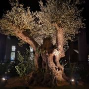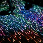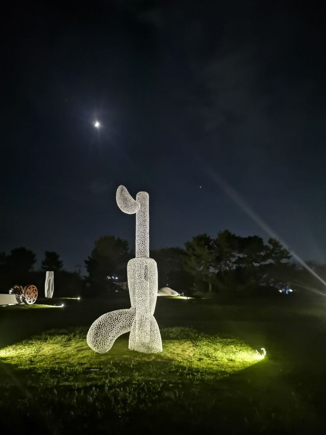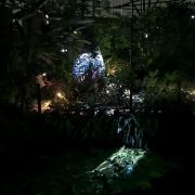 夜晚的常盘公园,雕塑们在月光和灯光的映衬下,显得更加精致。特别是植物馆从2001年开始的夏末夜活动,吸引了很多游人。今年的活动主题是“光の道,水の道”,在一间大房子里,四面墙从上往下飘落汉字,用手影抓到它,就立刻落地,同时会出现与该字相关联的动态画面,特别吸引小朋友。另一侧植物馆内,沿着步道,用光做出了鱼群,追逐着人群。还可以看享受着灯光和音乐的植物。