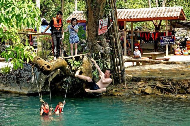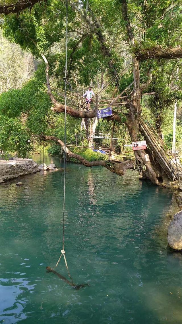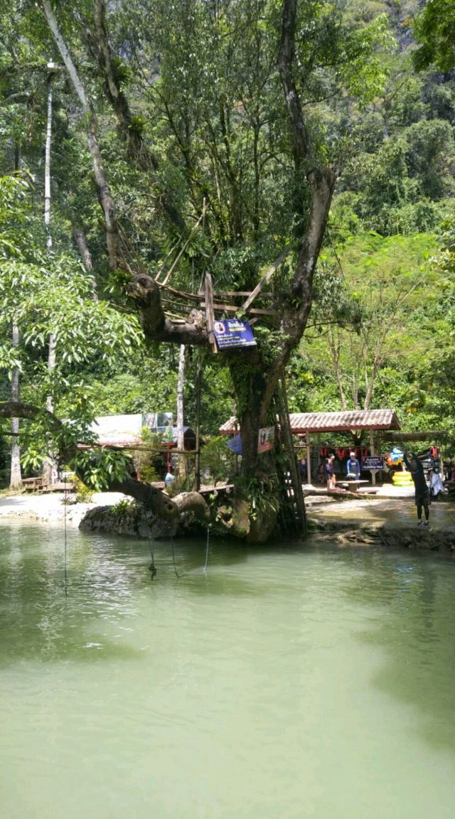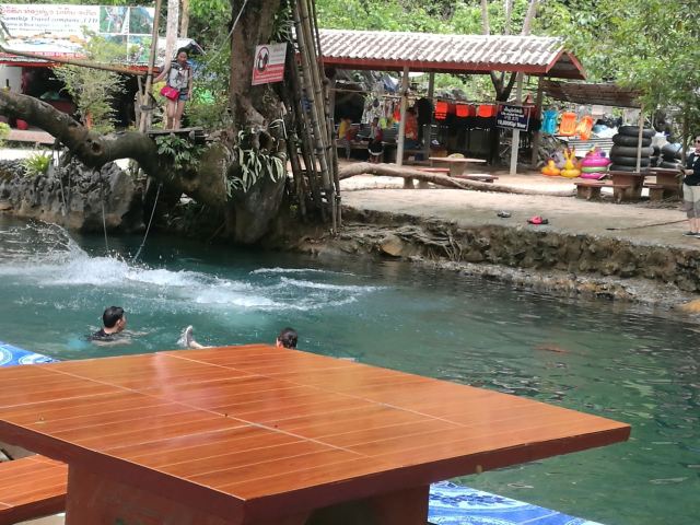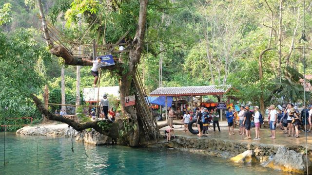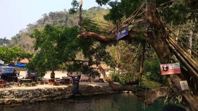 5分 超棒万荣距离首都万象仅160公里,在越战时,这里曾经是美军的机场。万隆特有的喀斯特地貌,吸引着无数的游客,茂密的参天古树,石灰岩山体蕴藏的千形百态的丰富溶洞资源,使其在世界上声名远播,迅速的成为了全世界户外运动者的圣地,浪迹天涯的背包客,嬉皮士梦寐以求的世外桃源。也难怪浙江卫视《一路上有你》,央视《远方的家》,韩国版的《爸爸去哪儿》都在这里疯狂取景。其中最出名的外景地就是要数蓝泄湖了。顾名思义,这是一个溶洞景观,泻湖只是从溶洞中流出的水,但他实在是耀眼,人们争相到此跳入蓝绿色的湖中,尽情的享受清凉,景色非常诱人,是深受世界游客喜爱的网红打卡地。据我的观察,韩国人特别多,在湖中穿着泳衣游来游去,很多小鱼也跟着一起游动,十分惬意的模样。游客可以从高达6米的一棵古树上跳水。也可以拿着像荡秋千一样的手柄绳索跃入湖中。湖的两边都是烧烤和咖啡店,欧美客与韩国客比较多。如果第一次来老挝,可不要只想着大名鼎鼎的世界文化遗产 - 琅勃拉邦,这个万荣小镇也是绝对值得一逛。