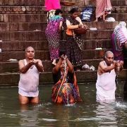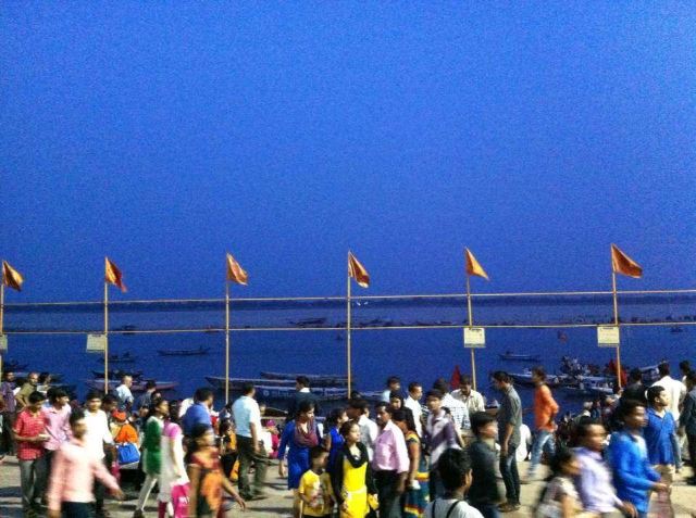 这里由五个大的石台组成,中间的主台非常大,两边各有两个小的。每天晚上这里祭祀活动都人山人海。夜幕降临,身着黄色丝绸法衣的祭司打扫、整理好法器后便开始当天的仪式,每个印度教徒都庄重地吟唱着圣歌,这是他们对河神的回应。河坛的台阶上出售鲜花、蒂卡、念珠等宗教用品的摊贩众多,来自各地的教徒、乞丐和游客聚集于此。