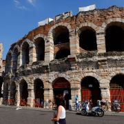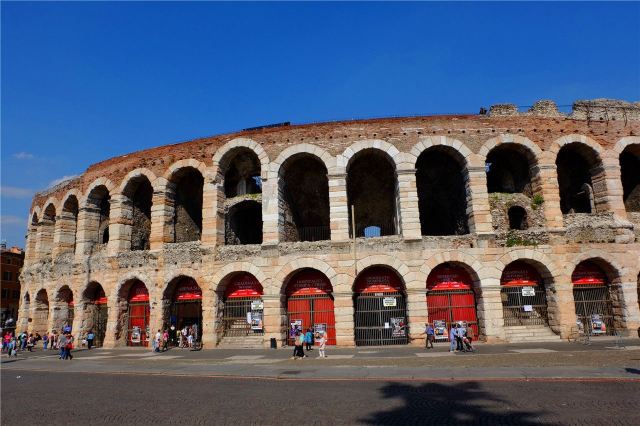 维罗纳圆形竞技场位于市中心布拉广场(Pza.Bra)附近,在意大利境内规模仅次于罗马斗兽场,是古罗马时代圆形剧场的遗迹。剧场建于公元1世纪,至今依然完好地保存着当年的原貌,每年7到9月间歌剧节期间还会举办各种大型歌剧表演。