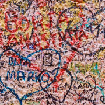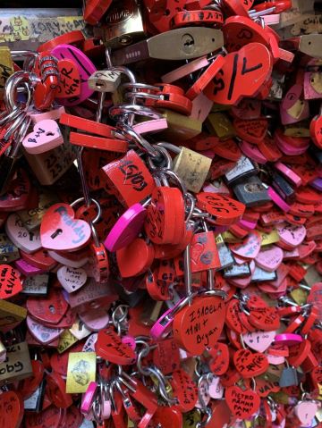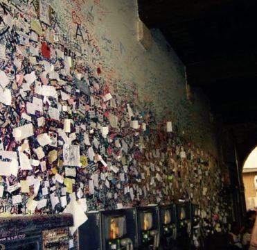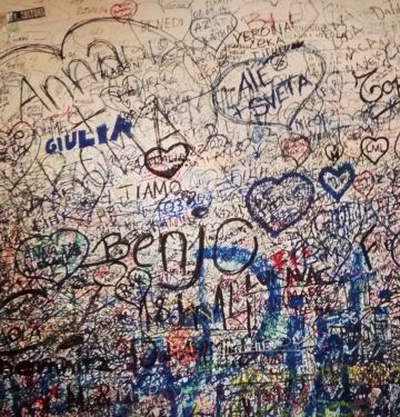 另外,庭院内还有一座有名的“爱墙”,就在阳台的下方,墙上密密麻麻写满贴满了各种语言的两个连在一起的名字,用心圈在一起,用丘比特的箭穿在一起,用各种颜色和图案装饰起来,据说在墙上把两个相爱的人的名字写在一起就可使他们的爱情天长地久。
