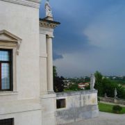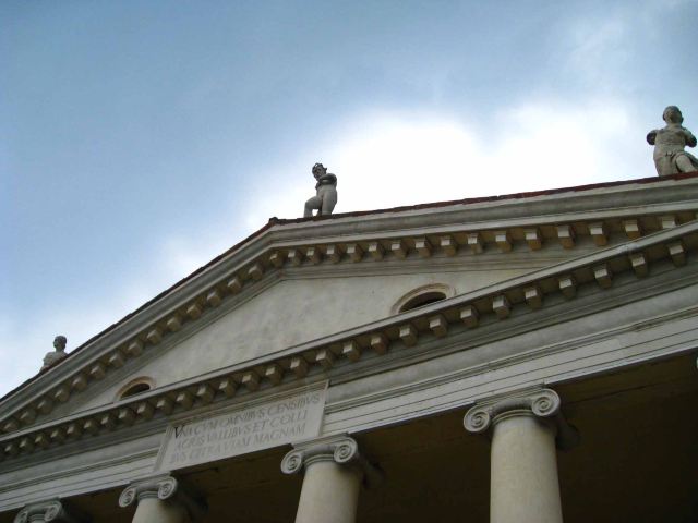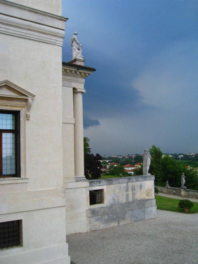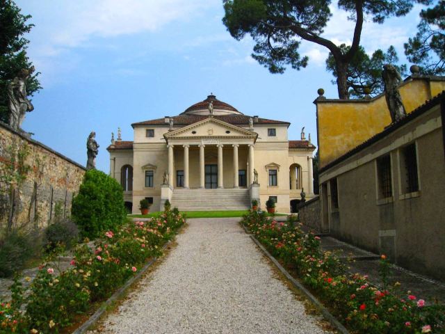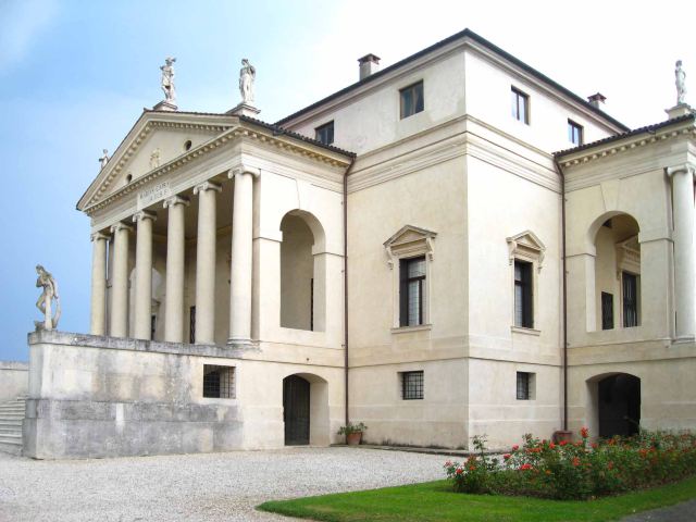 圆厅别墅,为文艺复兴晚期典型建筑,在维琴察的一小山丘上,采用对称手法,平面呈正方形,四面都有门廓,正中为一圆形大厅。厅上冠以一碟形穹隆,外观高出四周屋顶。可以说是帕拉蒂奥建筑思想的集中体现。
