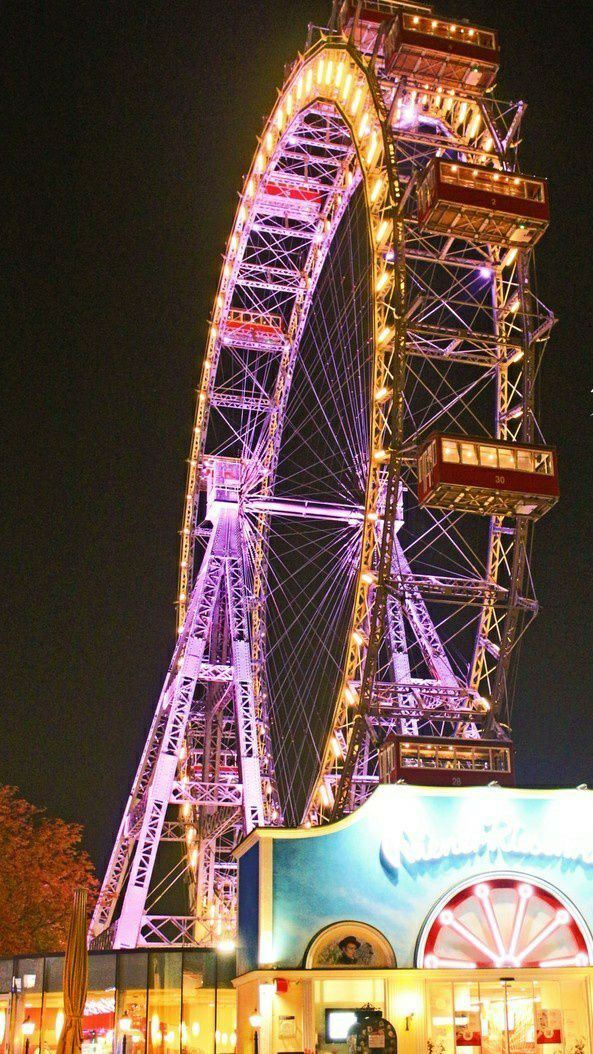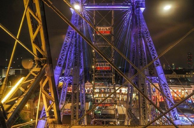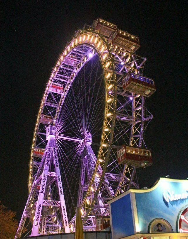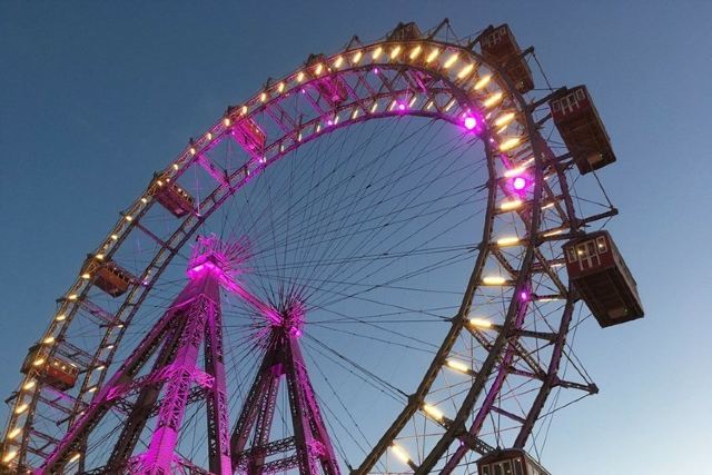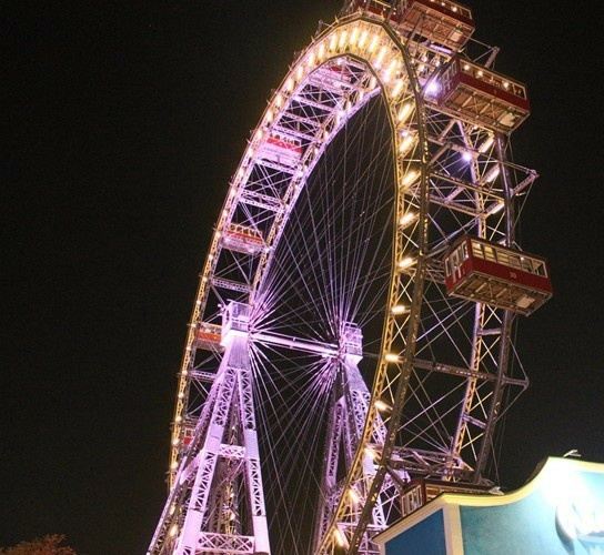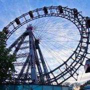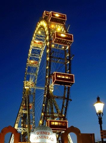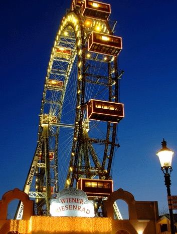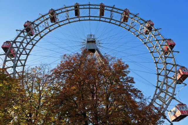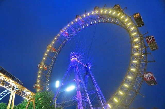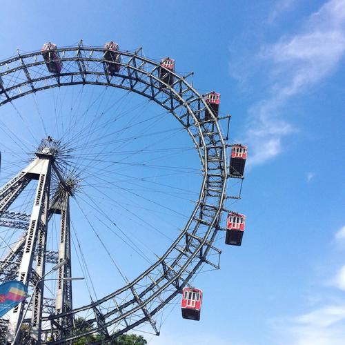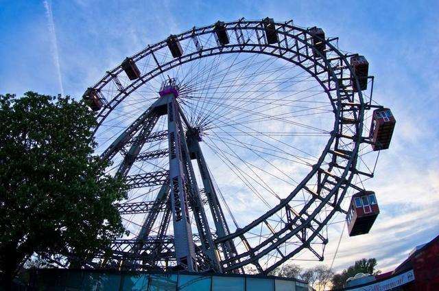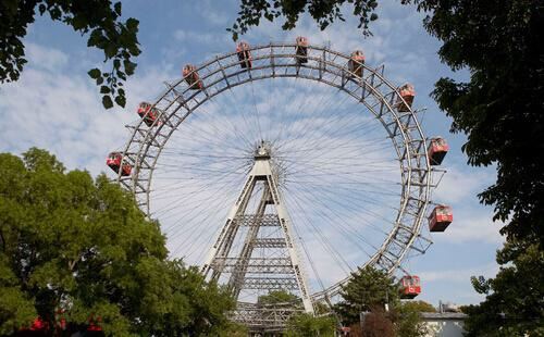 普拉特公园里的维也纳摩天轮是城市的地标之一。为纪念弗朗茨·约瑟夫皇帝登基50周年,维也纳人在1897年建造了这座摩天轮。维也纳摩天轮坐落在普拉特游乐园右侧的入口处,高65米,直径近61米,通体钢制结构重达430公吨,转速为2.7千米/小时。一直以来,它都是维也纳天际线的象征,坐拥这座多瑙河畔之城的旖旎风光。