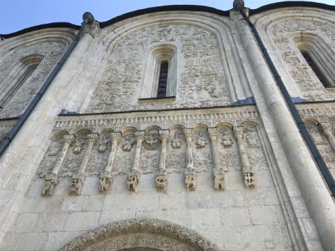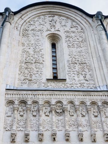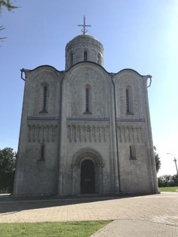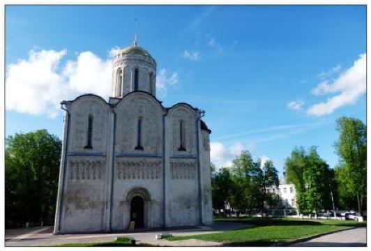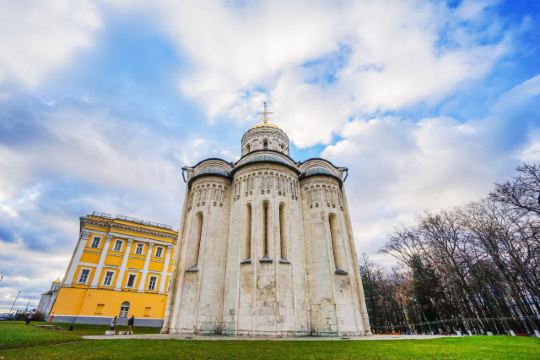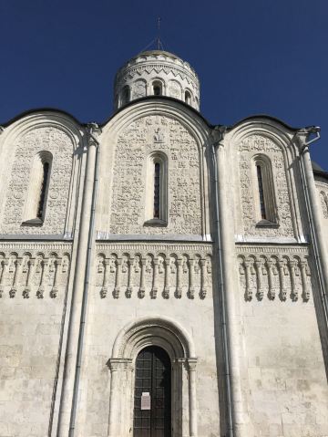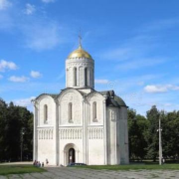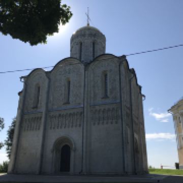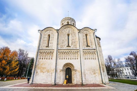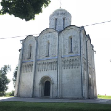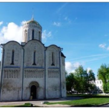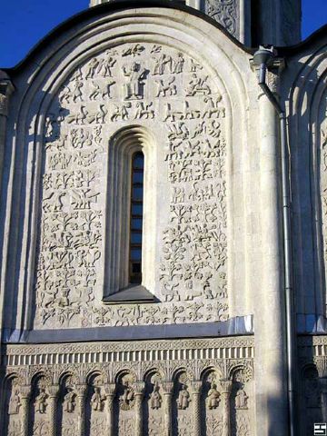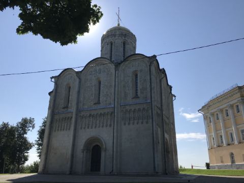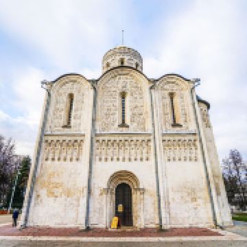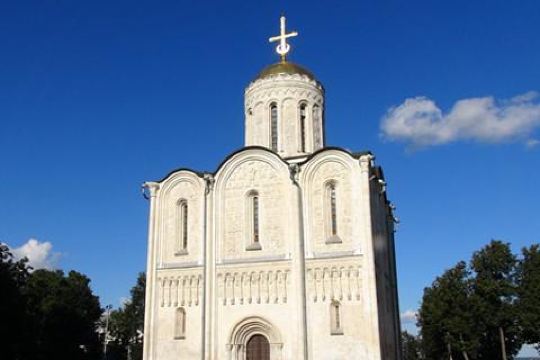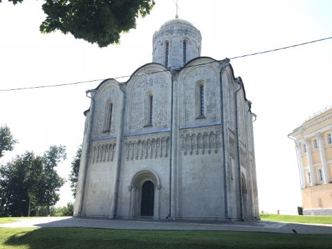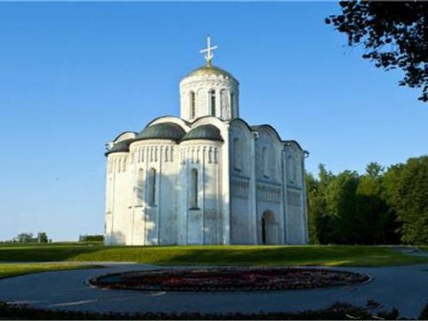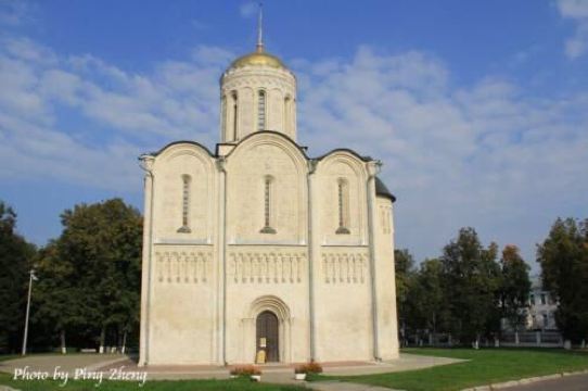 德米特里教堂建于12世纪,是弗拉基米尔比较美丽的教堂,举世闻名。以白色石灰岩建成,窗户小,属传统的建筑类型。因为石灰石质地较软、易于雕刻,墙上雕刻着动植物,是现存此类建筑中少有的外观有雕刻的教堂。