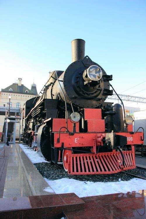 海参崴火车站站台上有一台蒸汽机车,它是为纪念二战时期英勇的铁路工人设立的实物纪念碑,这里也是俄罗斯火车站开始的地方。