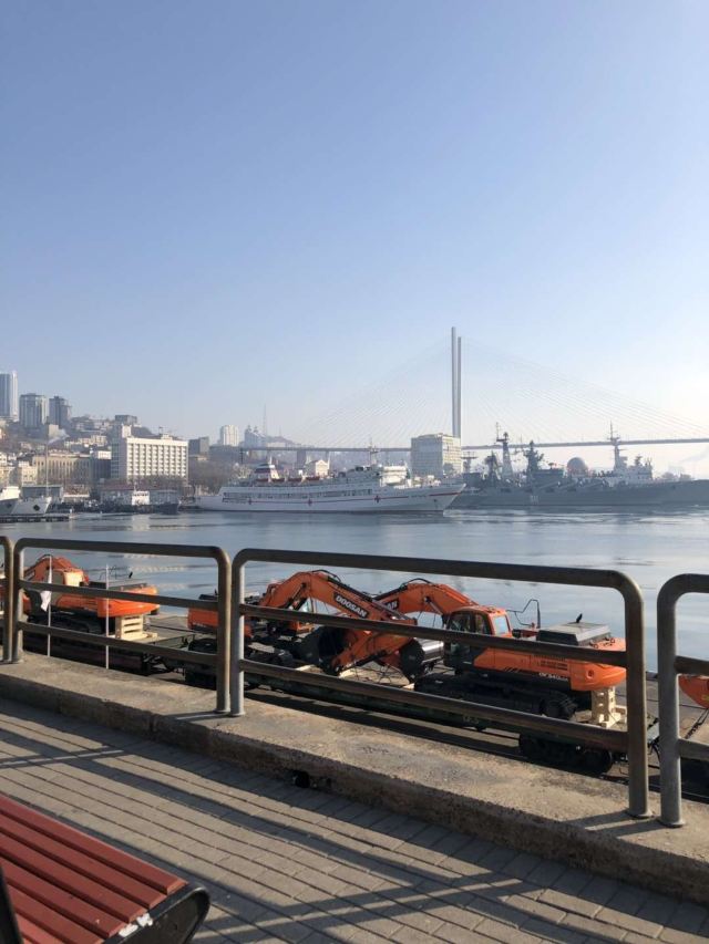坐游轮来到了海参崴的港口,这个港口很有意思,因为它和海参崴的火车站是在一起的。