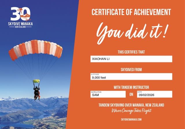 Skydive Wanaka是瓦纳卡的跳伞公司,目前提供两种高度的跳伞项目,分别从15000英尺或12000英尺的高空起跳,经过60秒或45秒的自由落体后开始4-5分钟的降落飞行,还可选择带有影像纪录的套餐。