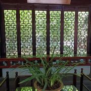 园林首先给人的感觉是假山很多,其次是复廊很长,还有就是标志性建筑沧浪亭,这些构成了园林的精华。假山顶沧浪亭的柱子上,有上句出自欧阳修、下句出自园主苏舜钦的对联一副:清风明月本无价,近水远山皆有情。在亭子里坐坐,可欣赏园林四周葱郁的景色。复廊穿梭于园林中,有棚,雨天也不会影响到游园的兴致。复廊墙上有一扇扇镂空花窗,花纹各不相同,据说全园共有108种花窗样式。