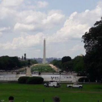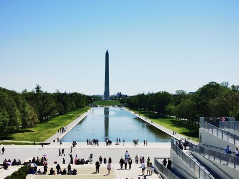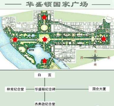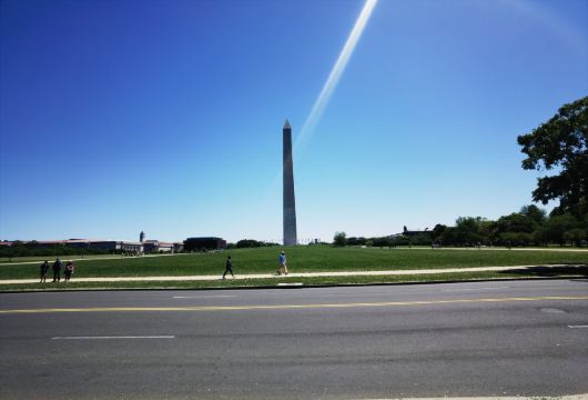 华盛顿纪念碑位于国家广场的正中央,为纪念华盛顿而建立,555英尺高的方尖碑拔地而起,华盛顿特区明文规定周围任何建筑不得高于华盛顿纪念碑,表明了华盛顿在美国民众心中崇高的地位,也使得华盛顿纪念碑成为华盛顿内举目可见的一个地标。