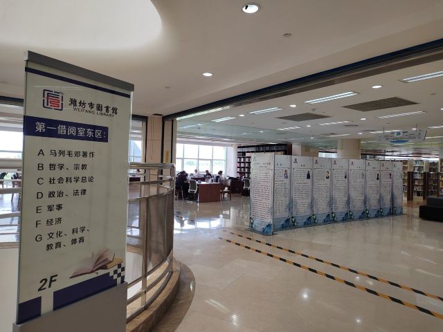 潍坊市图书馆设立于1948年8月7日,历经60多年的发展,秉承“公益、公平、高效”的办馆宗旨,坚持服务立馆、品牌强馆、创新活馆、人才兴馆的理念,多次被文化部评为文明图书馆,是山东省古籍保护、共享工程建设与服务、地方文献工作先进单位。新馆位于市民文化艺术中心,建筑面积3.6万平方米,可藏书两百万册。