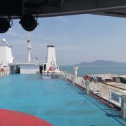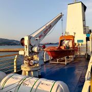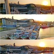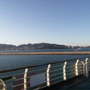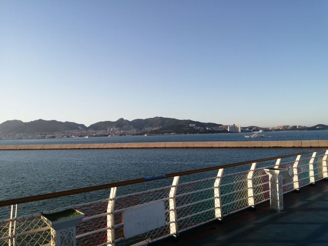 5、上到星光甲板,这里是船上最高点,俯瞰码头和海面,让人心旷神怡、愉悦舒心,游轮17:00启航时会先掉头,落日已为海面上涂抹了一条红线,这时要提前想好拍照角度、背景和自己的姿势,因为船掉头时是动态的,时机转瞬即逝,要快速抓拍连拍,背景是夕阳的话脸会背光,这点要提前考虑到。两侧的救生艇、船尾的双子烟筒等都是比较好的拍照设施。船到刘公岛会掉头返航,此时拍完照后早到楼下占前排座位。