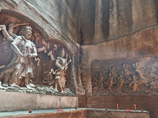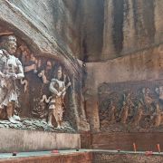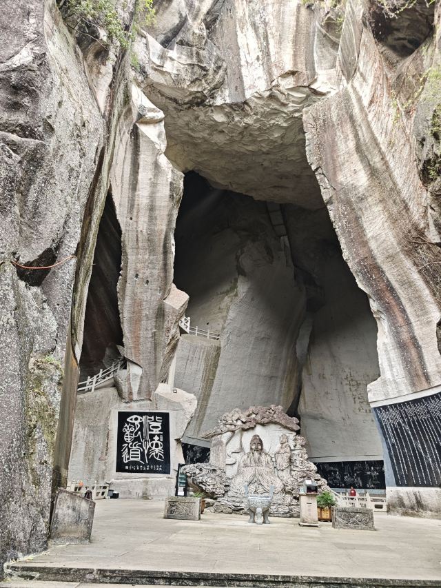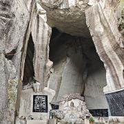 硐内巨大石雕弥勒佛像高5米,宽7米。大佛慈颜,使人见之生喜,知名品牌有亚洲唯一的岩硐音乐厅,曾因2002年4月28日成功举办了"中国首届岩硐音乐会"而蜚声海内外。有直径2.12米的石雕大碗,已列入世界吉尼斯记录。石文化长廊:33尊石雕壁观音。硐顶多处穿通,天光云影照得硐内通明,游人有身在世外桃源之感觉。