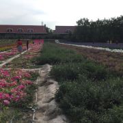 七彩花田是园内主要的观赏区域,位于园内的中心处,每年6-7月份是观赏时期,其他季节则没有花朵,来到景区仅能参观博物馆。花田内按条形状种植了多种彩色花卉,不同颜色的花卉一条条错落相间,十分漂亮。在花田间,还设置了稻草人、鲜花彩门、风车、雕塑等装饰,使得整个场景很浪漫,适合拍照摄影。