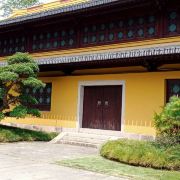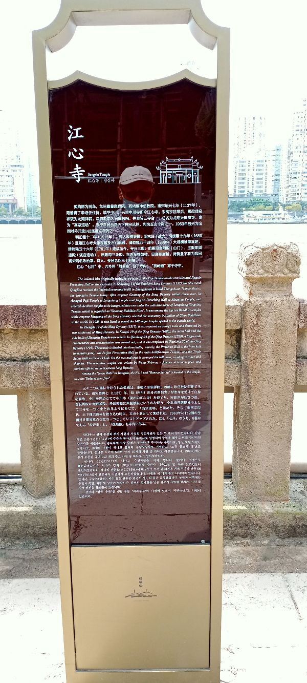 江心寺位居温州市北郭永清门外瓯江之中的一个小岛屿上,本名龙翔禅寺,但因独特的地理位置而俗称“江心寺”。寺院原来面积仅约一平方公里左右(现经填塞淤浅扩大地面,添建了新的游览点),两端各有一座小山峰,峰顶都有一座凌空的宝塔,即名为东、西塔。东峰西麓原有“普寂禅院”,西峰东麓有“净信讲寺”又名“西塔院”(即今“温州博物馆”)。江心寺内主要建筑有钟鼓楼、大雄宝殿、三圣殿、方丈室、斋堂等。现存之江心寺为清乾隆五十四年(1789)重建,面积约2870平方米,分前、中、后三殿。前殿为金刚殿,东西有长廊,两端置钟鼓楼。今宋代古钟尚存。中殿为正殿,为壮观。殿内槛联匾额,琳琅满目。正柱联为宋王安石撰并书。后殿三圣殿,殿额与对联皆为弘一法师所书。寺院大门两边有题为宋王十朋撰书的叠字联:“云朝朝朝朝朝朝朝朝散,潮长长长长长长长长消”。