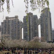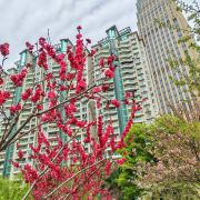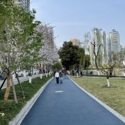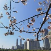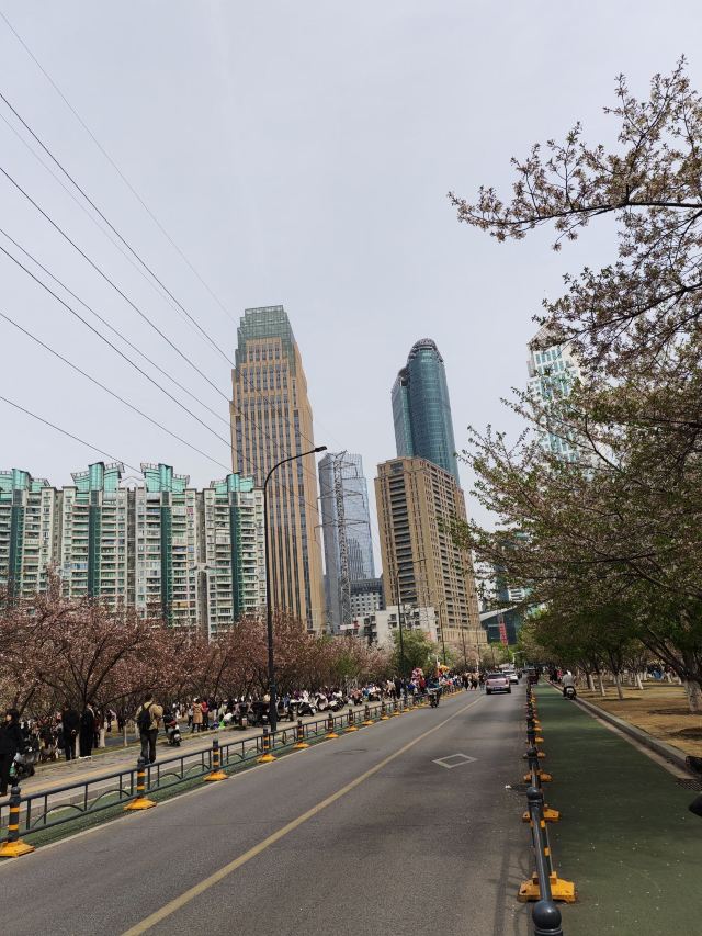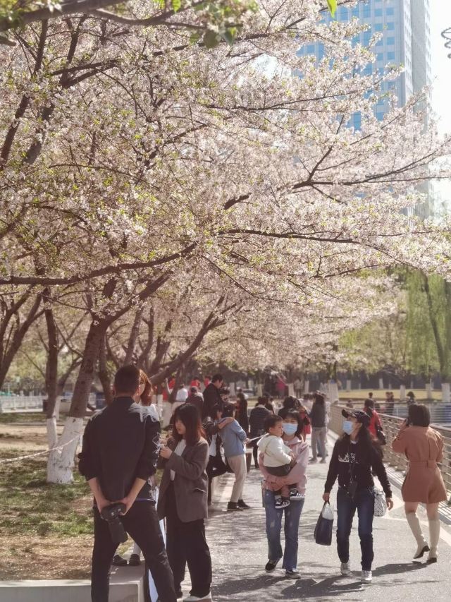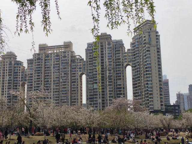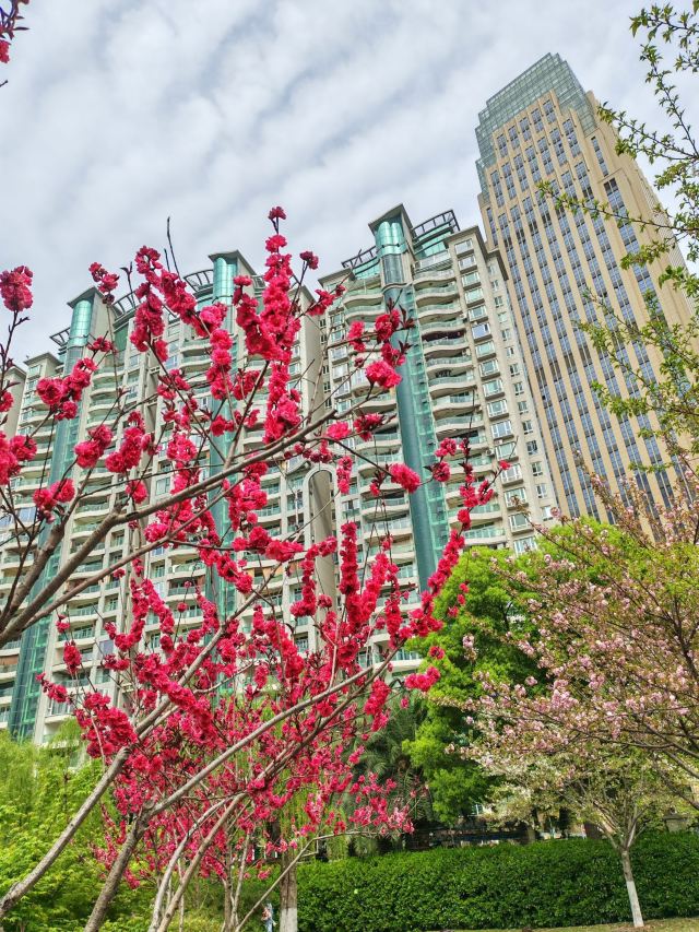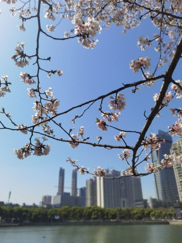 粉嫩的樱花在枝头肆意绽放,花朵层层叠叠,微风拂过,樱花如雪般飘落,洒在地上、湖面上,如梦如幻。与樱花相映成趣的是周边的建筑,现代化的高楼大厦矗立在公园周围,玻璃幕墙在阳光下闪烁着光芒,展现出城市的繁华与活力。