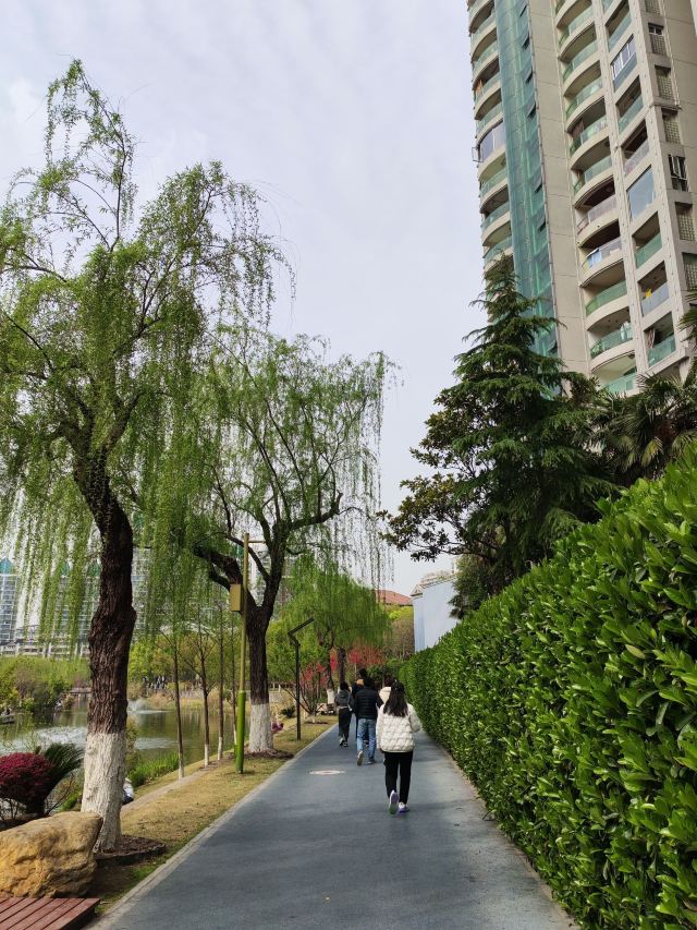 沿湖漫步,绿树成荫,繁花似锦。垂柳依依,细长的柳枝随风摇曳,似温柔的少女在翩翩起舞。各类花卉争奇斗艳,红的像火,粉的像霞,白的像雪,花香与青草的气息交织在一起,弥漫在空气中,让人沉醉。