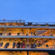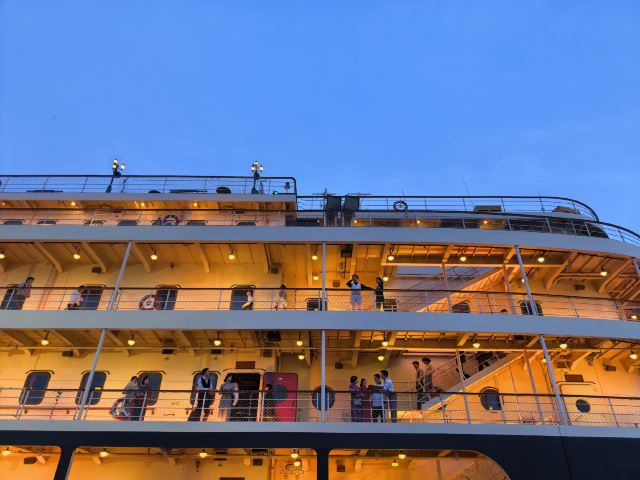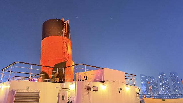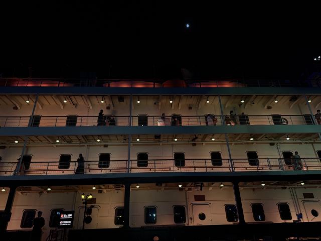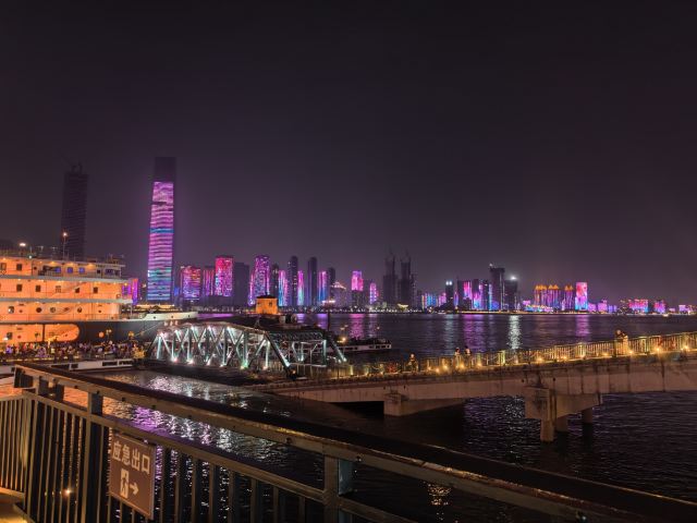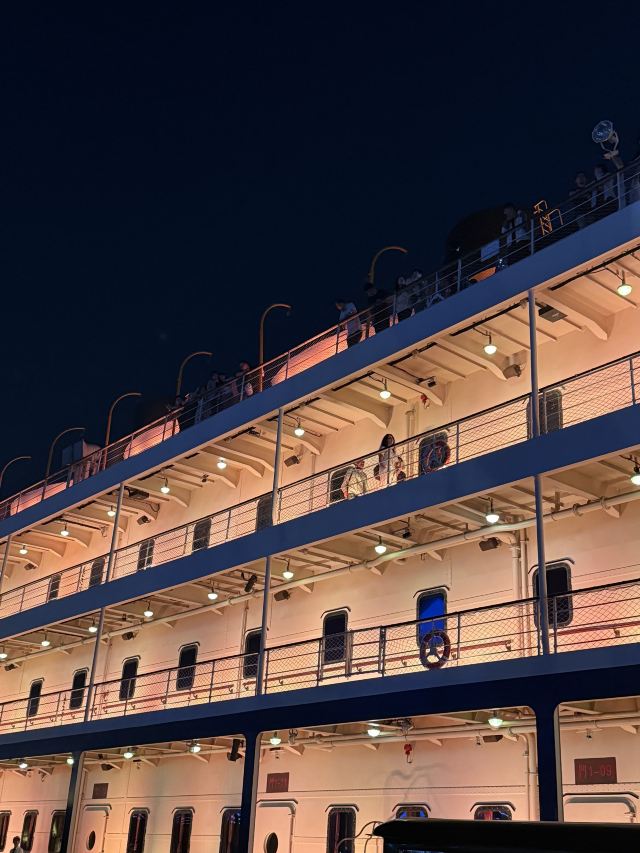 最后上到顶层甲板,船正好驶入江心。两岸是长江灯光秀的璀璨长卷,江风迎面吹来,耳边还回响着刚才的旋律。那一刻真的觉得:武汉的浪漫,一半都在这条船上了。