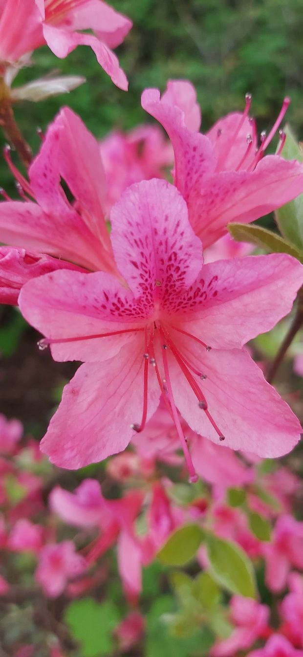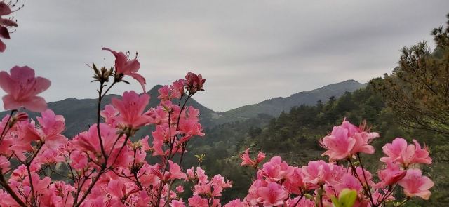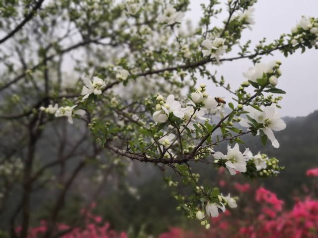 来到花丛中立刻便被那艳丽色彩所吸引。漫山遍野的杜鹃花把个山坡层层浸染。漫步其中,让人倍感兴奋。那红粉色显得娇媚动人;那白粉色则娇羞万分楚楚动人。流连其中,久久不愿离去。