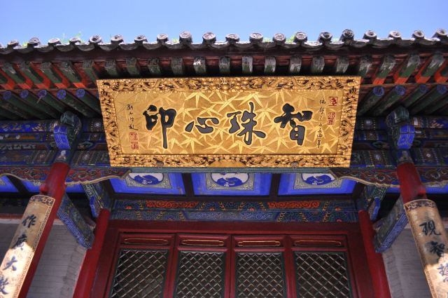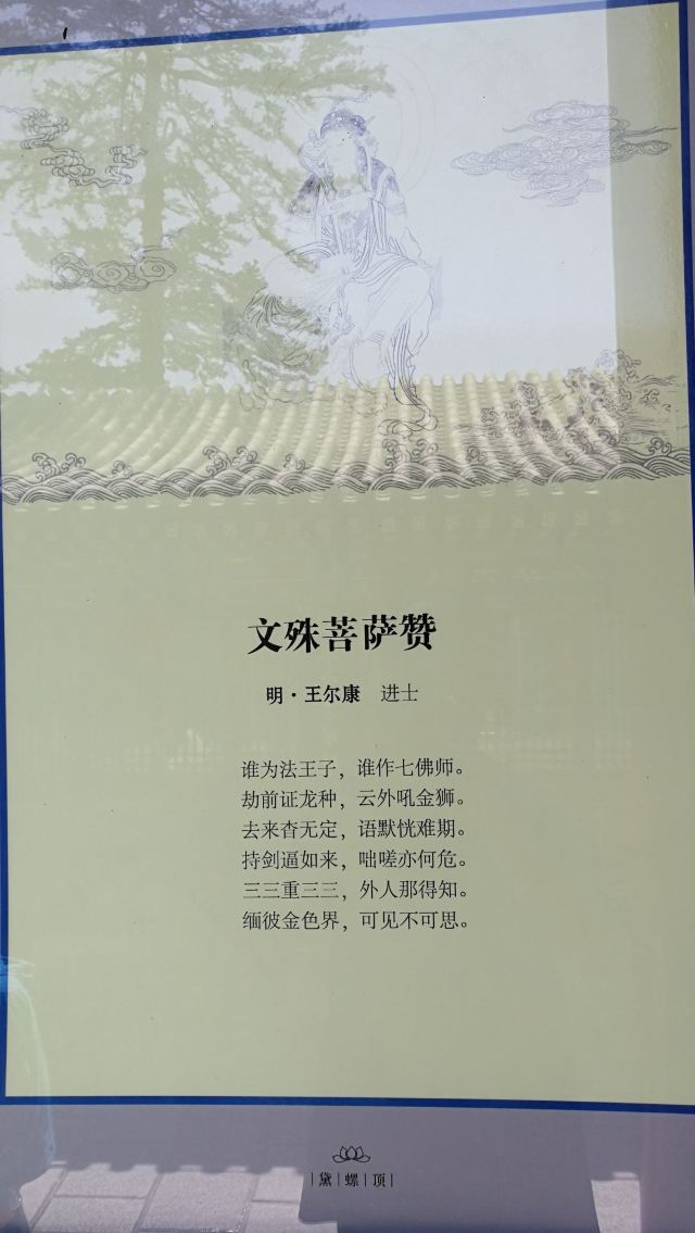 沿着台阶路登顶之后,就看到了黛螺顶的牌楼、石狮和山门了。黛螺顶(寺)的中轴线上由西向东依次有天王殿、旃檩殿(站坛殿)、五文殊殿和大雄宝殿。在旃檩殿内,你能看到一尊站立在佛坛之上释迦牟尼佛像,而不是常见的盘坐模样。五文殊殿内还供奉有五个文殊菩萨像,分别为孺童文殊、无垢文殊、智慧文殊、聪明文殊、狮子吼文殊。