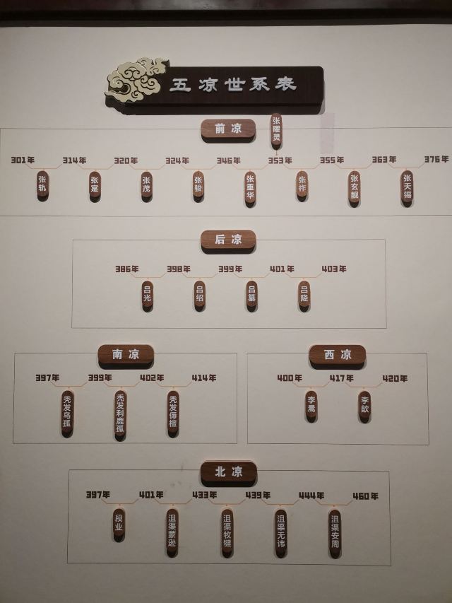 西晋永宁元年(301年),张轨出任凉州刺史,前凉算基。而后,品光(氏)、秀发鸟孤(鲜卑)、沮渠蒙逊(匈奴)和李黑分别创立后凉、南京、北凉、西凉,与前凉并称“五京”。除西凉外,其余四凉皆曾建