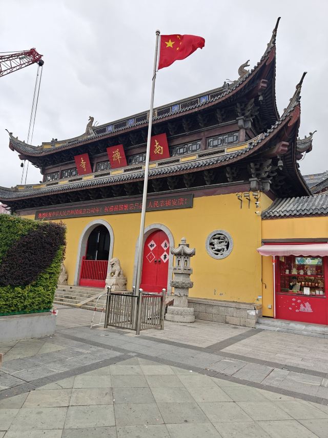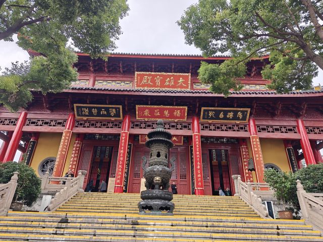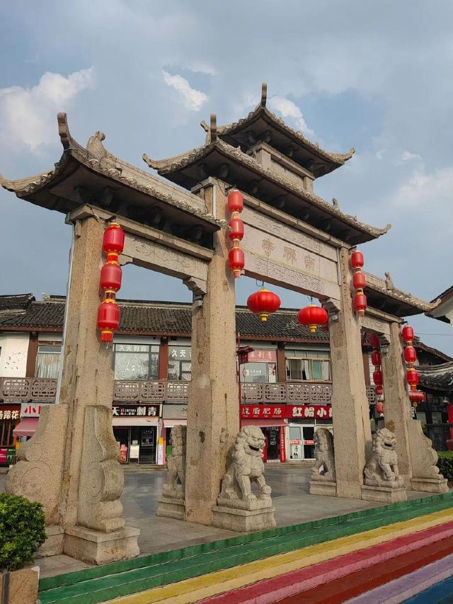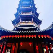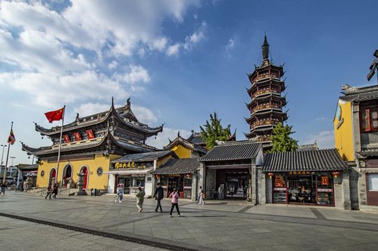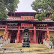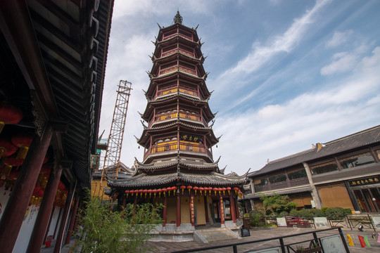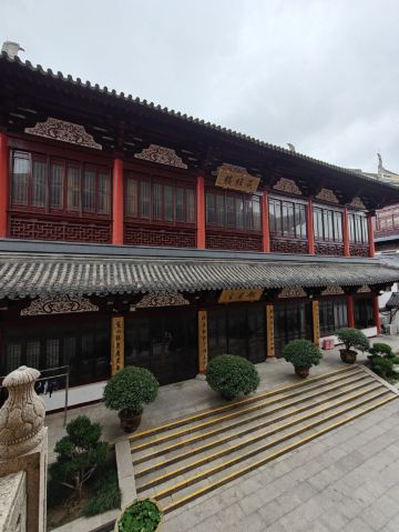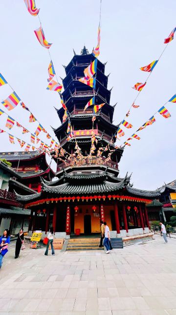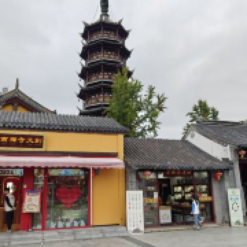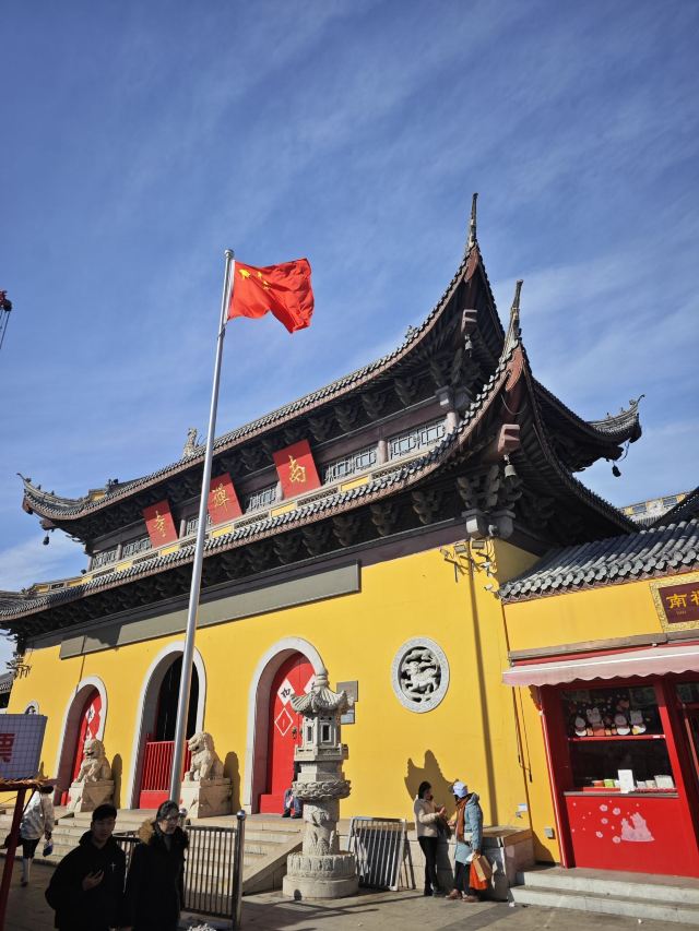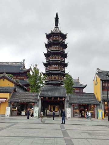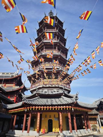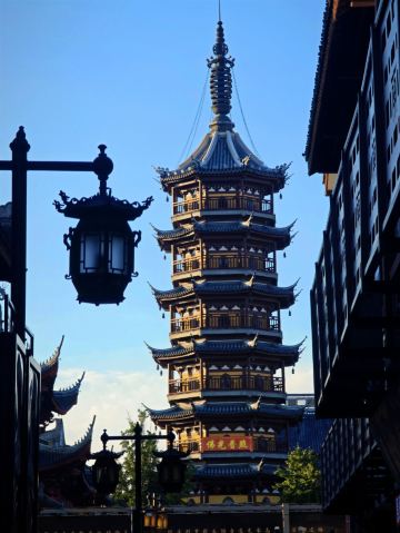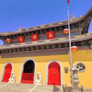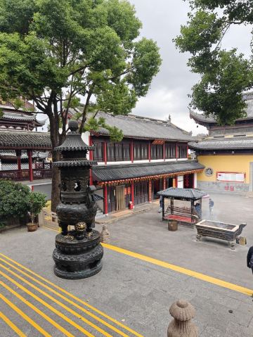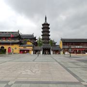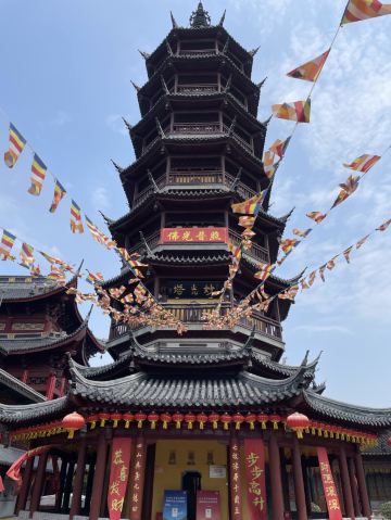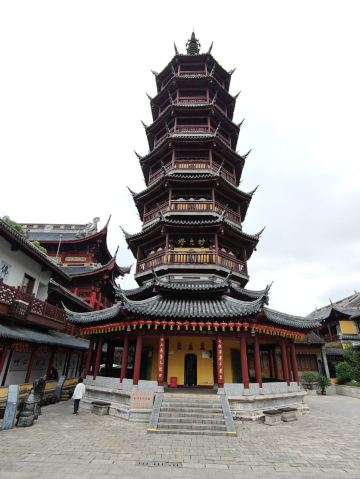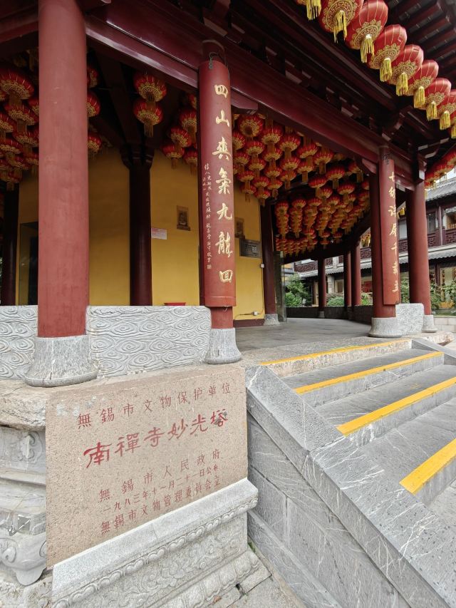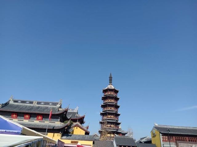 寺庙的大门在南端,南北走向的中轴线上仅有大雄宝殿等几座建筑。东侧的妙光塔高7层,在塔上看底下仿古建筑连成一片的屋顶,眺望南边古运河畔的南禅寺码头,依稀有一幅古运河画卷在眼前展开的感觉。寺庙大门东侧的素食馆有素斋吃,可以点外卖带走。