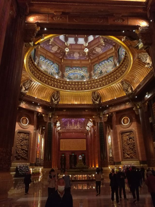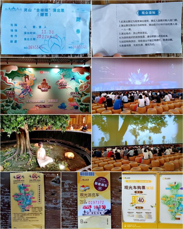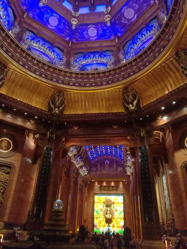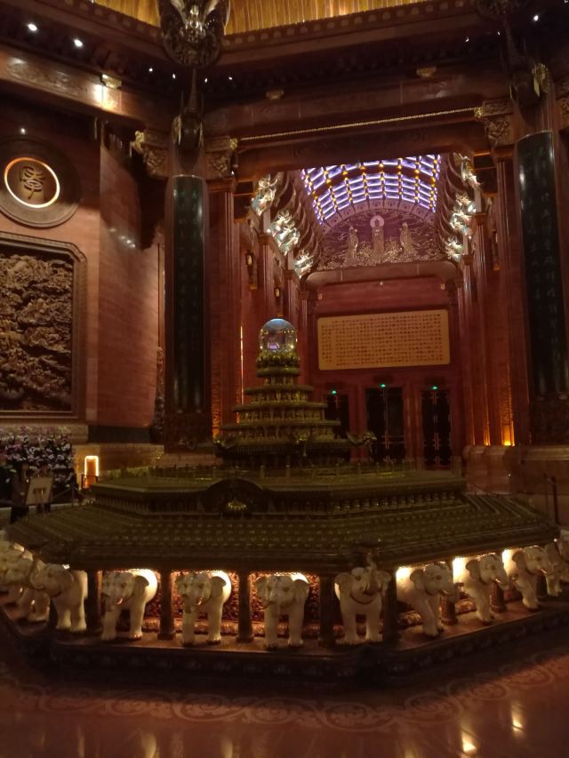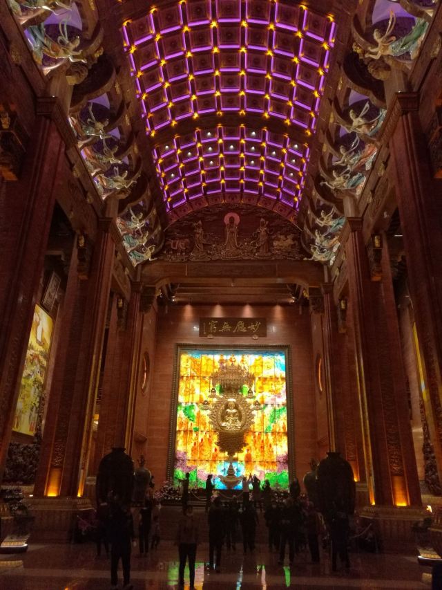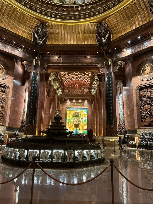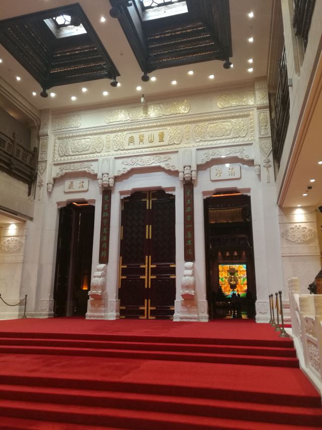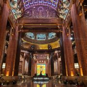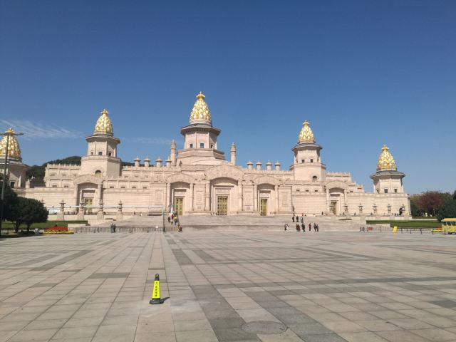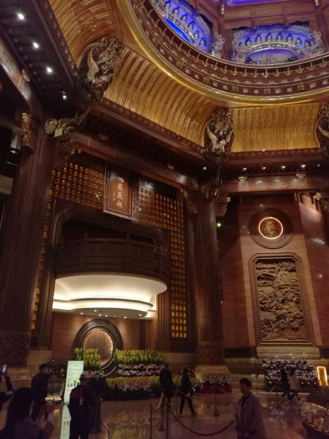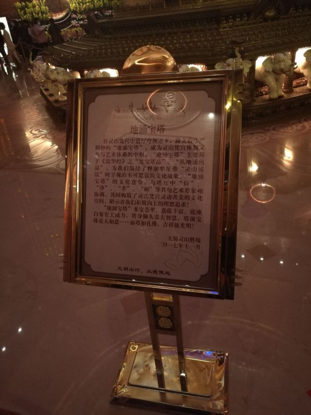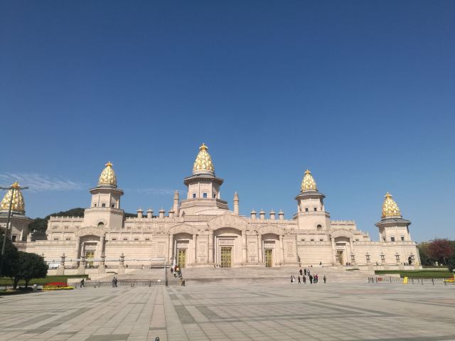微信小程序灵山梵宫位于灵山胜境内,与灵山大佛比邻而立,是一座相当华美的佛教宫殿,内部有精美的装潢和展品,值得细看。当这里不举行会议时,每天还有如梦如幻的演出灵山吉祥颂,壮观震撼,不容错过。宫殿的外观以华藏塔风格为主,并融合了石窟与传统佛教建筑元素,大块的石板外墙上布满了精美的浮雕,五个金色尖顶非常大气。走进宫殿,殿内的东阳木雕、敦煌壁画、扬州漆器、景泰蓝须弥灯、寿山石雕、景德镇青花斗彩缸等艺术珍品让人目不暇接。宽敞的大厅金碧辉煌,你会看到人形的十二生肖金像,各个坐姿不同,神态逼真。来到中庭,精雕细琢的高大穹顶气派非凡,蓝色的顶端宛如苍天;前方梁柱上有不同形态的仙人雕像,仿佛就要飞出来一般。穿过中庭走到底,可以看到一堵闪耀着奇光异彩的高墙,这就是镇馆之宝“华藏世界”。墙面有100平方米大,由160块琉璃烧制而成,上面有浮雕,中间镶嵌着“一大四小”五座金佛,上方是一块木匾,写着“妙应无穷”四个金字,整个作品可谓耀眼夺目。再到圣坛看看,这个宽敞的会场引人注目的莫过于它斑斓的大穹顶,不断变化的灯光让人好似进入梦境一般。这里的灵山吉祥颂演出讲述释迦牟尼放弃皇太子地位及奢靡的生活,出家修行,历经磨难后成佛的历程,你可以坐在蒲团坐垫上来观赏。另外,在宫殿2楼还有一个珍宝馆,展示许多当代美术工艺大师的作品,包括玉雕、瓷器、绘画等,可以大饱眼福。在3楼的五观堂还可以品尝斋饭。宫殿外面还有广场、香水海、曼飞龙塔、五印坛城等佛教景观建筑,可以细细观赏。