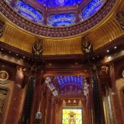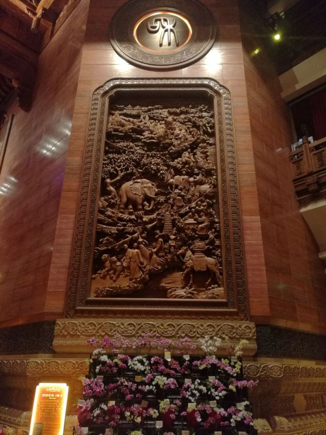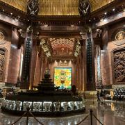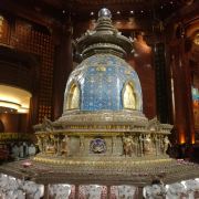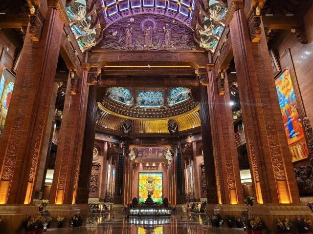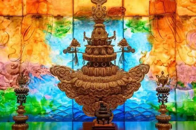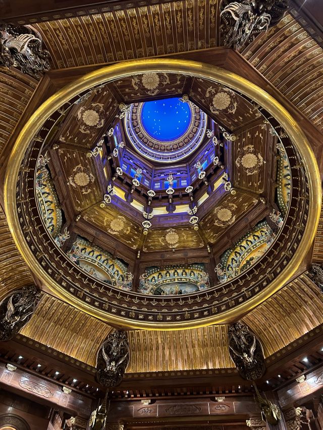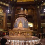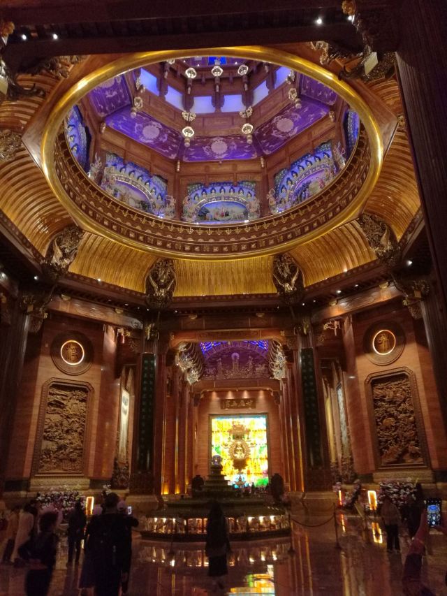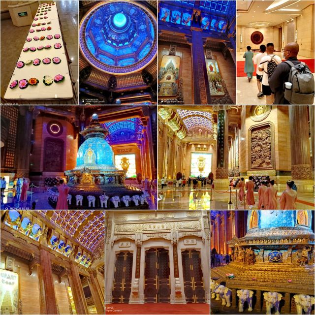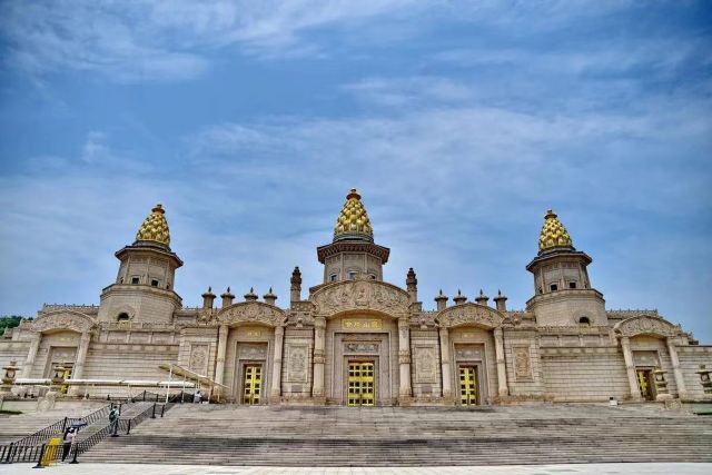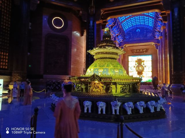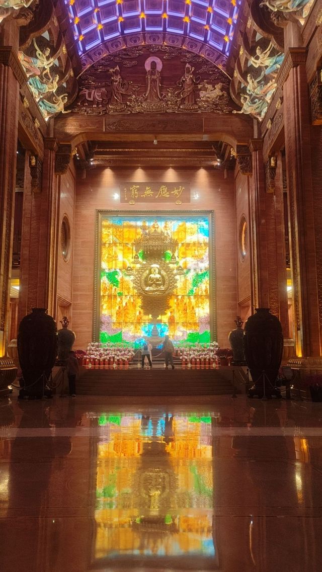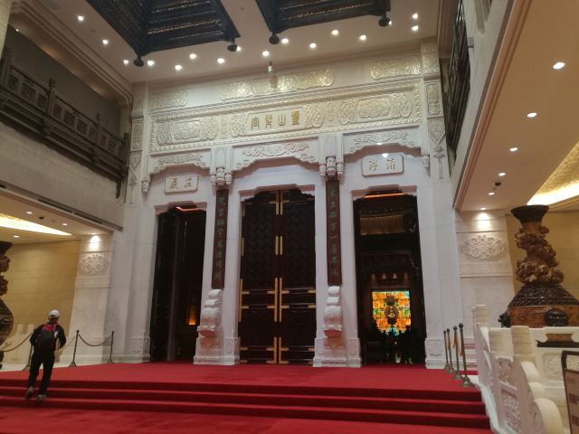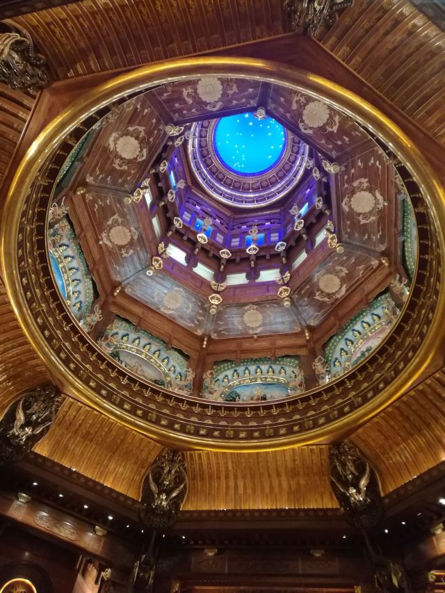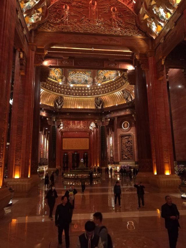 微信小程序灵山梵宫位于灵山胜境内,与灵山大佛比邻而立,是一座相当华美的佛教宫殿,内部有精美的装潢和展品,值得细看。当这里不举行会议时,每天还有如梦如幻的演出灵山吉祥颂,壮观震撼,不容错过。宫殿的外观以华藏塔风格为主,并融合了石窟与传统佛教建筑元素,大块的石板外墙上布满了精美的浮雕,五个金色尖顶非常大气。走进宫殿,殿内的东阳木雕、敦煌壁画、扬州漆器、景泰蓝须弥灯、寿山石雕、景德镇青花斗彩缸等艺术珍品让人目不暇接。宽敞的大厅金碧辉煌,你会看到人形的十二生肖金像,各个坐姿不同,神态逼真。来到中庭,精雕细琢的高大穹顶气派非凡,蓝色的顶端宛如苍天;前方梁柱上有不同形态的仙人雕像,仿佛就要飞出来一般。穿过中庭走到底,可以看到一堵闪耀着奇光异彩的高墙,这就是镇馆之宝“华藏世界”。墙面有100平方米大,由160块琉璃烧制而成,上面有浮雕,中间镶嵌着“一大四小”五座金佛,上方是一块木匾,写着“妙应无穷”四个金字,整个作品可谓耀眼夺目。再到圣坛看看,这个宽敞的会场引人注目的莫过于它斑斓的大穹顶,不断变化的灯光让人好似进入梦境一般。这里的灵山吉祥颂演出讲述释迦牟尼放弃皇太子地位及奢靡的生活,出家修行,历经磨难后成佛的历程,你可以坐在蒲团坐垫上来观赏。另外,在宫殿2楼还有一个珍宝馆,展示许多当代美术工艺大师的作品,包括玉雕、瓷器、绘画等,可以大饱眼福。在3楼的五观堂还可以品尝斋饭。宫殿外面还有广场、香水海、曼飞龙塔、五印坛城等佛教景观建筑,可以细细观赏。