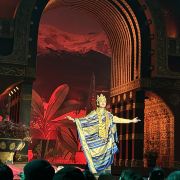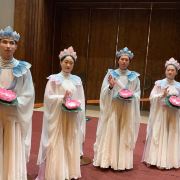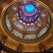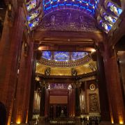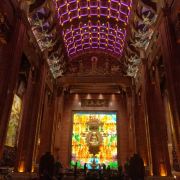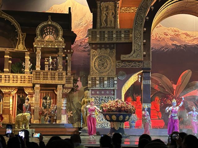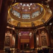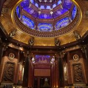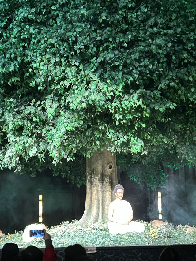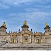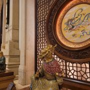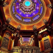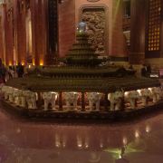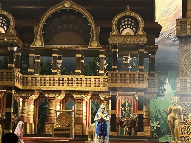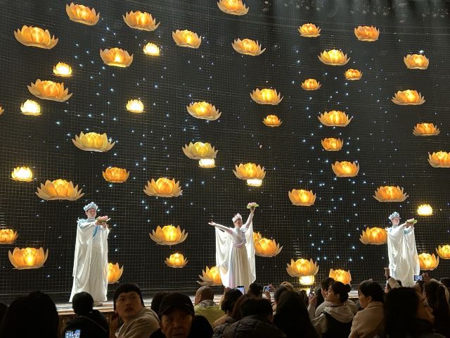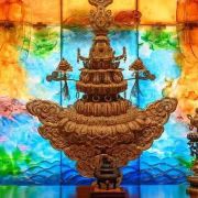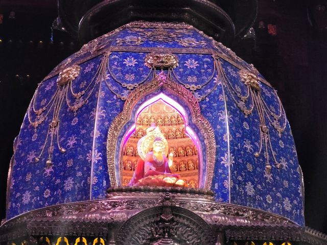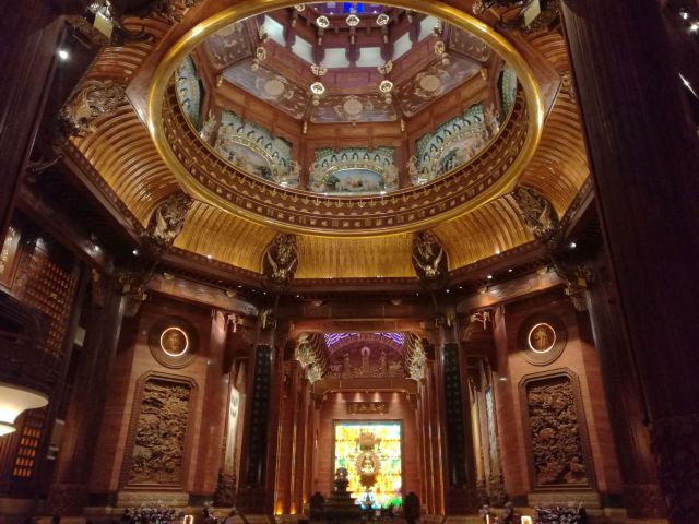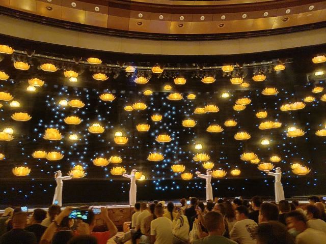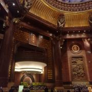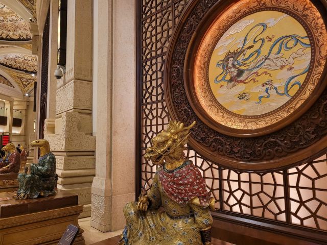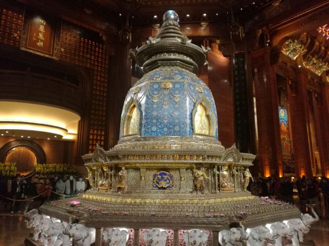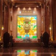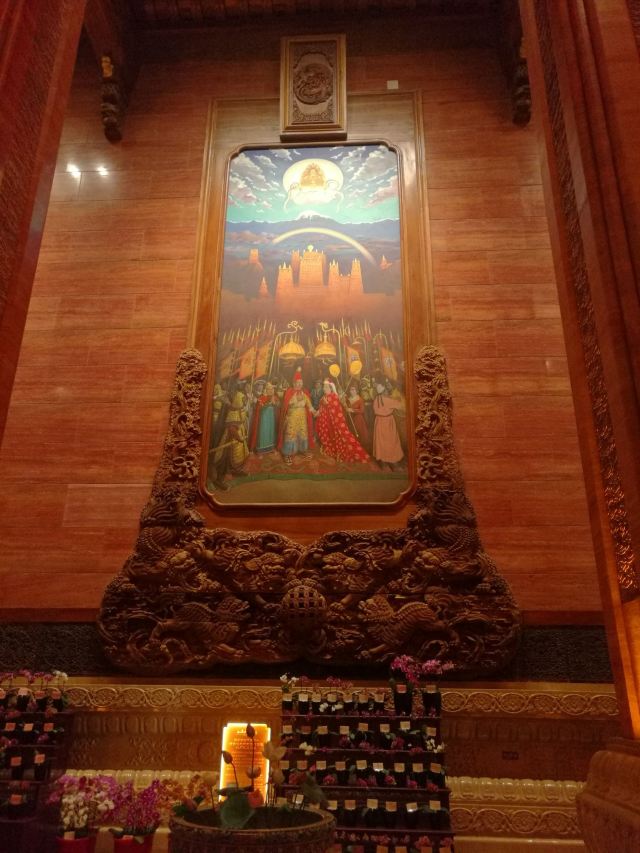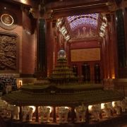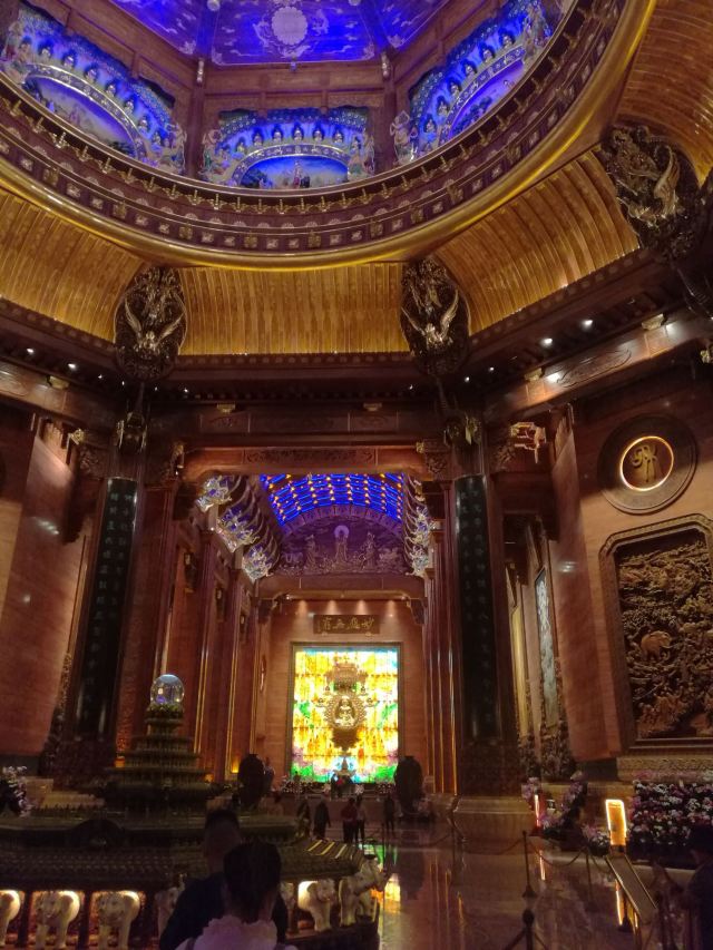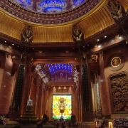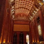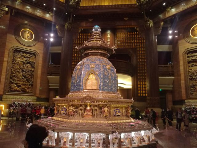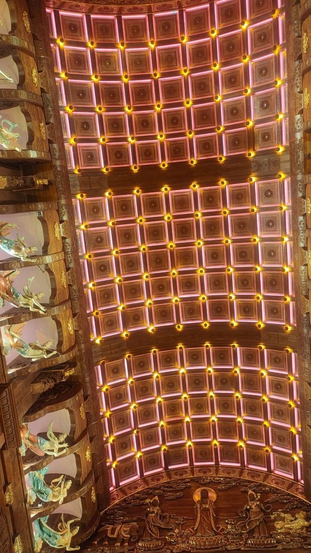 微信小程序灵山梵宫位于灵山胜境内,与灵山大佛比邻而立,是一座相当华美的佛教宫殿,内部有精美的装潢和展品,值得细看。当这里不举行会议时,每天还有如梦如幻的演出灵山吉祥颂,壮观震撼,不容错过。宫殿的外观以华藏塔风格为主,并融合了石窟与传统佛教建筑元素,大块的石板外墙上布满了精美的浮雕,五个金色尖顶非常大气。走进宫殿,殿内的东阳木雕、敦煌壁画、扬州漆器、景泰蓝须弥灯、寿山石雕、景德镇青花斗彩缸等艺术珍品让人目不暇接。宽敞的大厅金碧辉煌,你会看到人形的十二生肖金像,各个坐姿不同,神态逼真。来到中庭,精雕细琢的高大穹顶气派非凡,蓝色的顶端宛如苍天;前方梁柱上有不同形态的仙人雕像,仿佛就要飞出来一般。穿过中庭走到底,可以看到一堵闪耀着奇光异彩的高墙,这就是镇馆之宝“华藏世界”。墙面有100平方米大,由160块琉璃烧制而成,上面有浮雕,中间镶嵌着“一大四小”五座金佛,上方是一块木匾,写着“妙应无穷”四个金字,整个作品可谓耀眼夺目。再到圣坛看看,这个宽敞的会场引人注目的莫过于它斑斓的大穹顶,不断变化的灯光让人好似进入梦境一般。这里的灵山吉祥颂演出讲述释迦牟尼放弃皇太子地位及奢靡的生活,出家修行,历经磨难后成佛的历程,你可以坐在蒲团坐垫上来观赏。另外,在宫殿2楼还有一个珍宝馆,展示许多当代美术工艺大师的作品,包括玉雕、瓷器、绘画等,可以大饱眼福。在3楼的五观堂还可以品尝斋饭。宫殿外面还有广场、香水海、曼飞龙塔、五印坛城等佛教景观建筑,可以细细观赏。