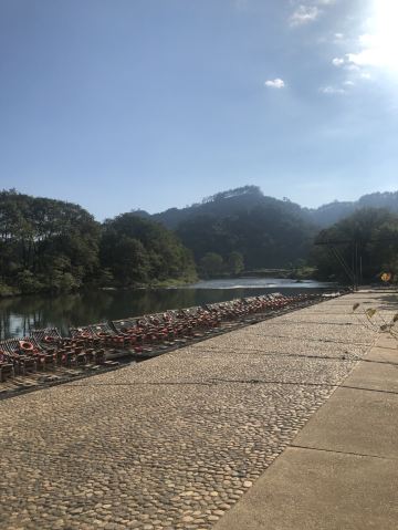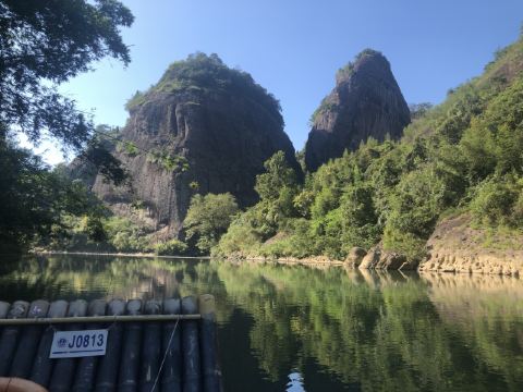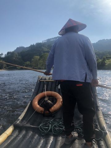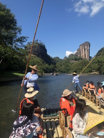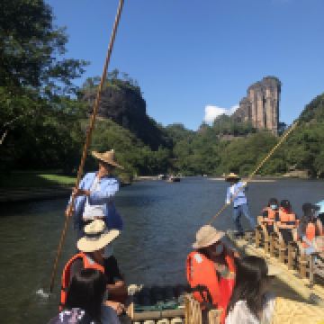 九曲溪竹筏漂流一般是从九曲到一曲顺流而下,这样随波逐流,更加轻快、迅疾。游九曲,所乘之舟为8-9根去皮毛竹烤后扎成。吃水浅、浮力大,游人乘坐安稳舒适,视野开阔,可见山景,能赏水色,顺九曲溪漂流而下既轻松惬意,又有惊无险。