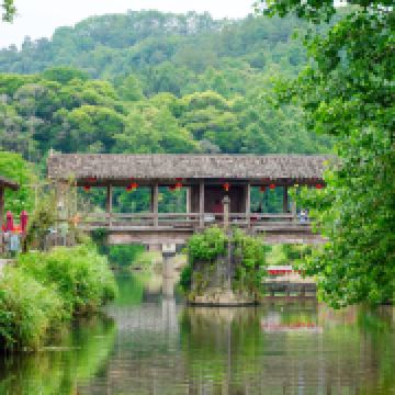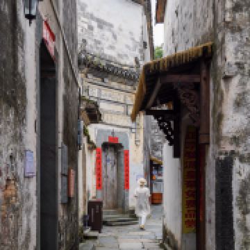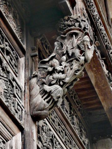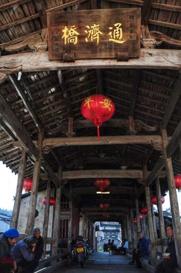 相比之下,思溪村的景致更好,走过河上的廊桥通济桥即是。往村中走不远,过振源堂来到百寿花厅,屋内96个字体各异的“寿”字刻在12扇落地长窗的窗格上,这种规模的百寿图镂雕在民间是非常罕见的。屋檐下的牛腿不是常见的狮子麒麟,而是闲雅的荷塘月色,伸嘴捕鱼的白鹭、盛开的荷花、肥硕的莲藕,别出心裁。