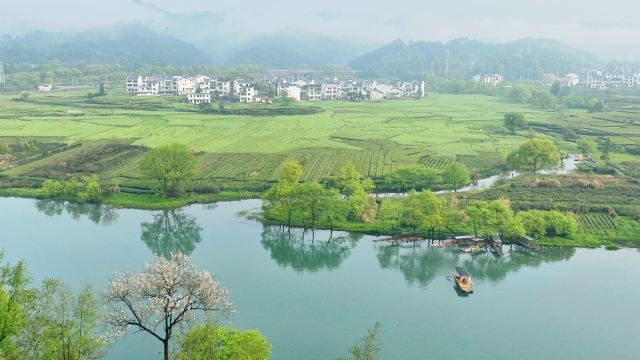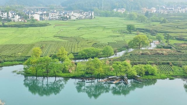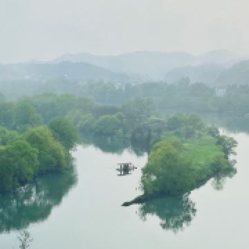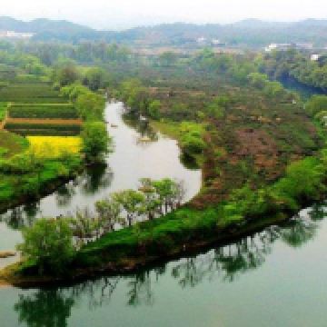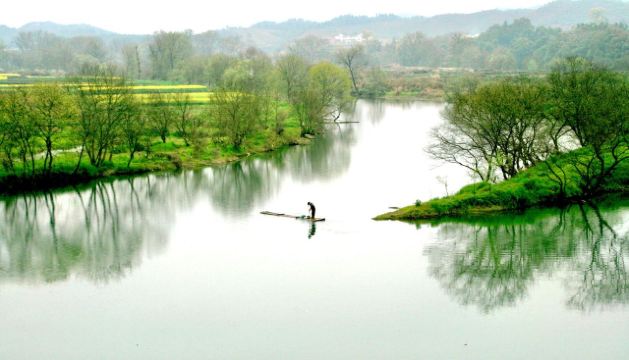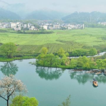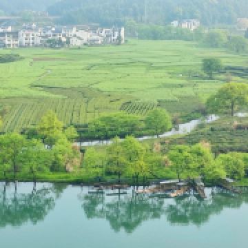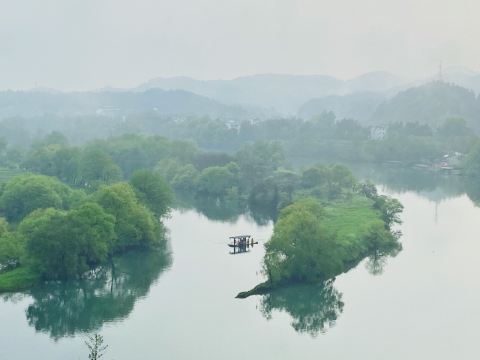 婺源月亮湾是去李坑景区的路上路过的一个小岛,多是摄影爱好者前来采风。清晨五点左右来俯瞰婺源月亮湾是美丽的,因为那时晨雾笼于水面上,白墙、黑瓦、金花、绿水在一片朦胧中更加亦幻亦真,宛如一张中国水墨山水画。