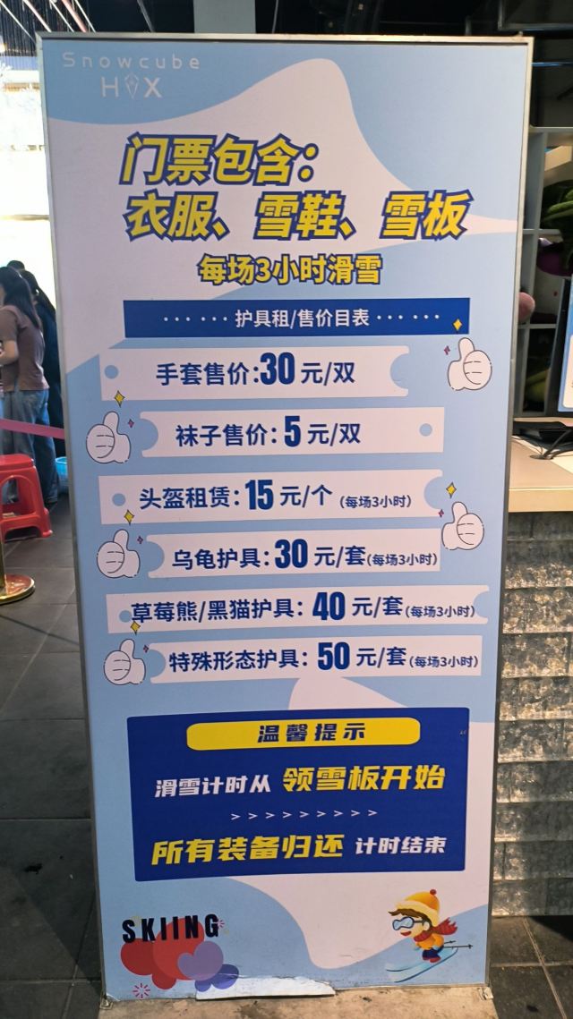必需品:租头盔(15元/人),租乌龟护具(30元/人),自带口罩和滑雪手套(不能买毛茸茸的手套,不然冰雪融化后手冷;现场买30元/对),租储物柜(十几元)。