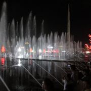 音乐喷泉共分为百米瀑布水池、八级跌水池及前端音乐水池三个区域。其中八级迭水池中的八级变频方阵是世界较大的方阵,喷头点达1024个,可以变幻成排山倒海、莲花朵朵、云海茫茫、海鸥展翅、蝶恋花、水雾等多种水型,流光溢彩,美轮美奂。
