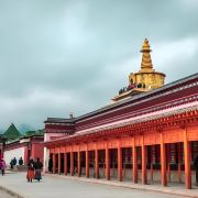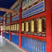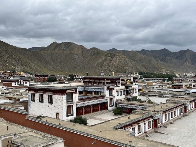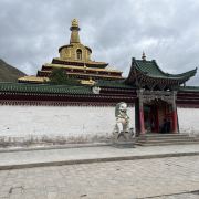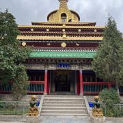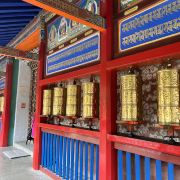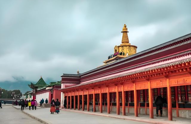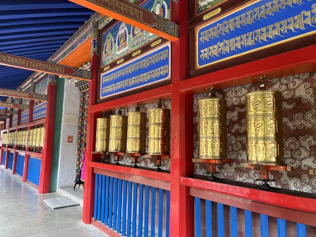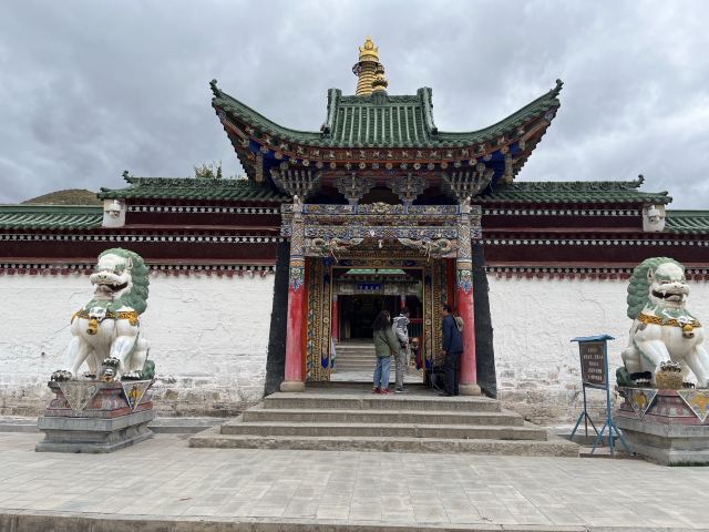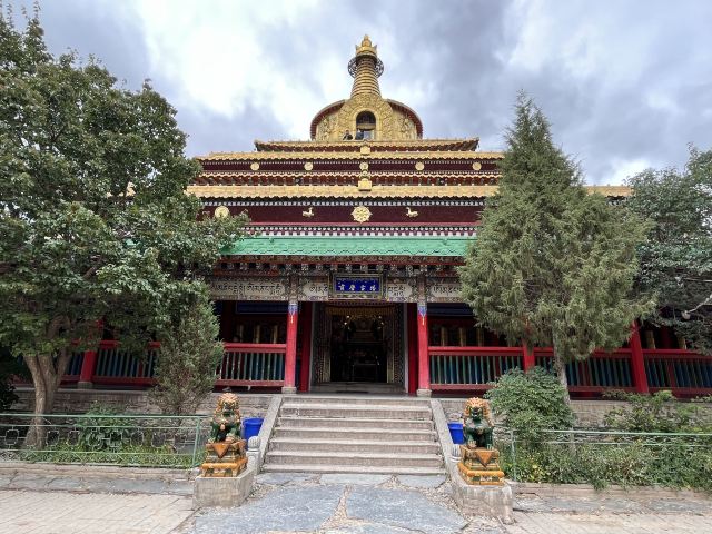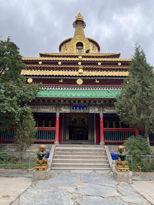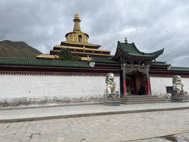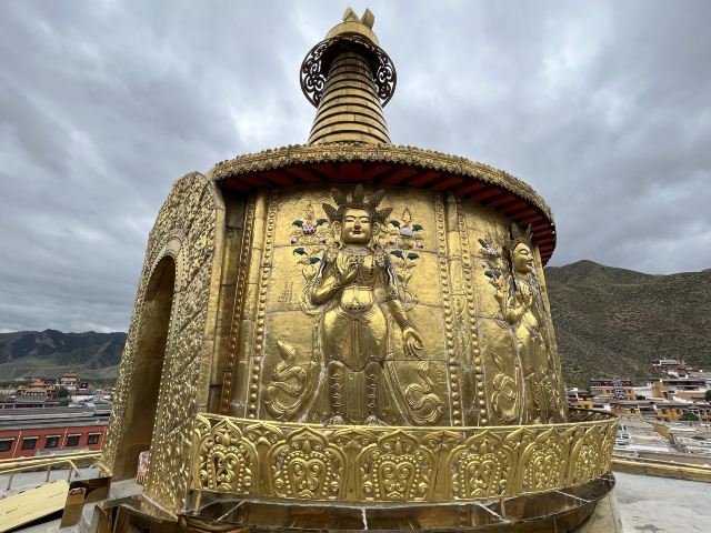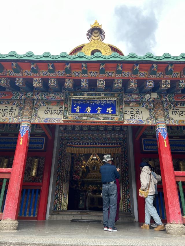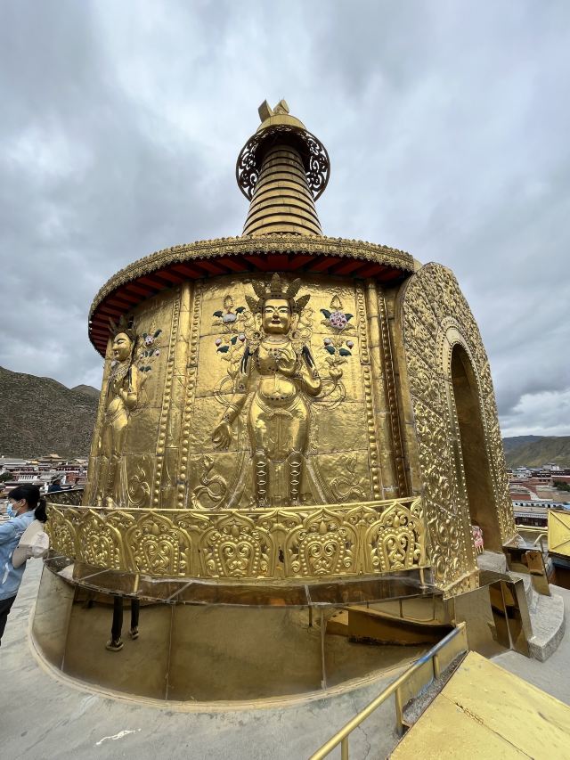 贡唐宝塔位于拉卜楞寺的南侧,游客从拉卜楞寺东侧沿转经路顺时针转寺时便会经过这里。远远便可看到一座五层高的巨大佛塔,塔顶是金色的圆柱形,侧面塑有精美又耀眼的佛像,非常壮观,可以先在外部拍照。