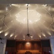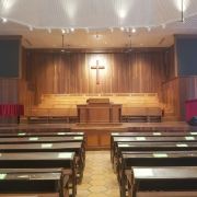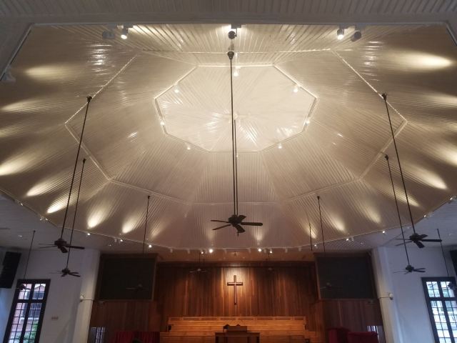 居中。室内宽敞明亮,会堂可容纳一千人左右的座位,中央是一个十米直径的穹隆,像一个大喇叭。室内音质效果很棒,所以这幢建筑不但有建筑功能,还包含着丰富的声学效应。