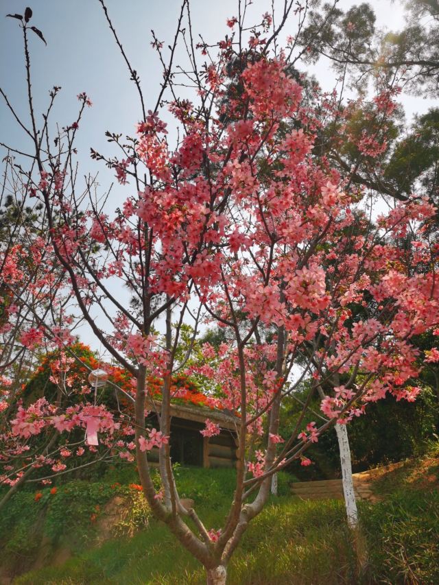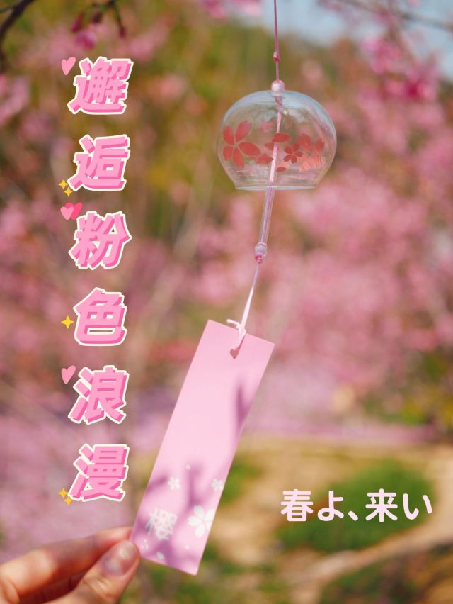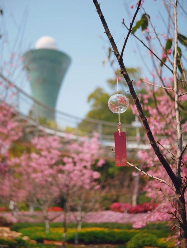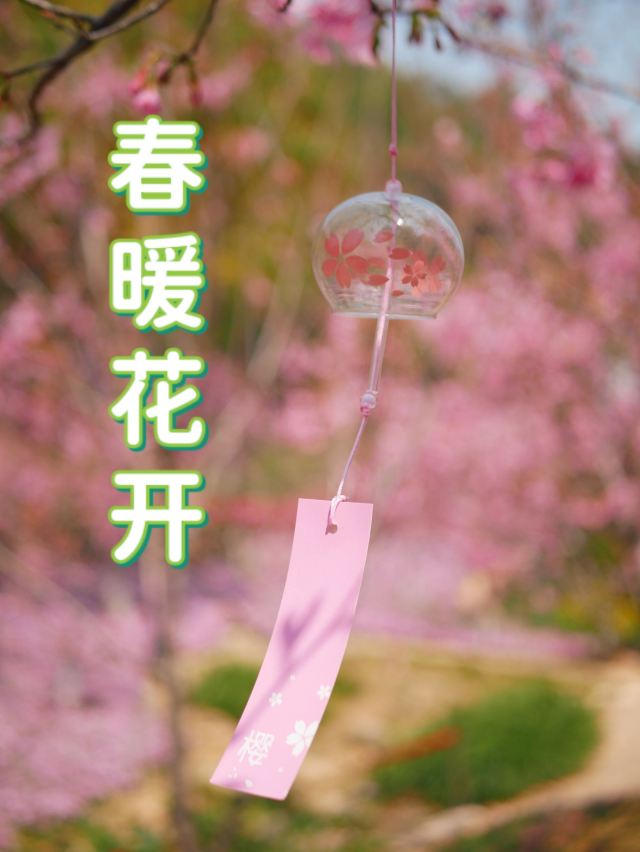 🌞和去年雨中赏樱花的感觉完全不同,晴天赏花多了分鲜艳和暖意。漫步在樱花谷的小路上,暖暖的阳光洒在身上,淡蓝天空下绽放的樱花,远远看去一株株樱花树远看像一团团粉红云朵,粉花枝头交叠,如云霞如梦境,十分梦幻,近看饱满艳丽特别迷人,粉嫩粉嫩的让人少女心满满,还夹带着淡淡的花香,再加上随风摇曳的风铃与樱花美景交织在一起🎐,空气中都弥漫着浪漫的味道,满眼都是春的颜色,分分钟出大片的节奏📸。