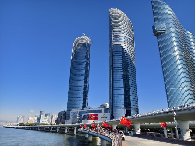 4分 满意去厦门出差,住在了双子塔这里的酒店,酒店对面就是这个观景台了,因为入住安顿好自己以后,出来溜达一下,刚好遇上美美的落霞,也看到很多人急急忙忙往观景台方向去,看来也都是要去拍照的吧。我也凑了一下热闹,观景台的角度挺不错的,可以拍到落霞与海面,落霞与双子塔,海面与双子塔。