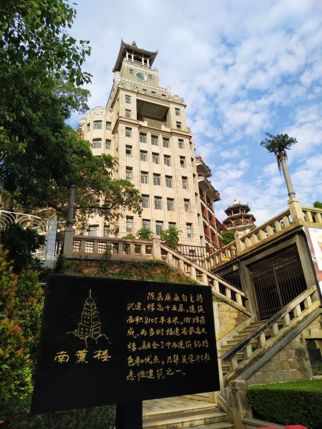 4分 满意南薰楼位于厦门市集美区,由主楼及两侧附楼组成,呈Y字形,矗立与于浔江西岸的制高点上,1957年6月建成。楼名取自虞舜时南风诗:"南风之薰兮,可以解吾氏之愠兮",以示陈嘉庚一生兴学造就后代的心愿。主楼为高15层的西式建筑,屋顶为中式方亭。塔楼顶部有“集美”两字。两侧附楼似展翅的双翼、凌云腾飞。南薰楼全部用细纹花岗岩建造,绿瓦飞檐,无论是建筑风格还是立面装饰,都为集美标志性建筑。为当时福建省最高楼房👍