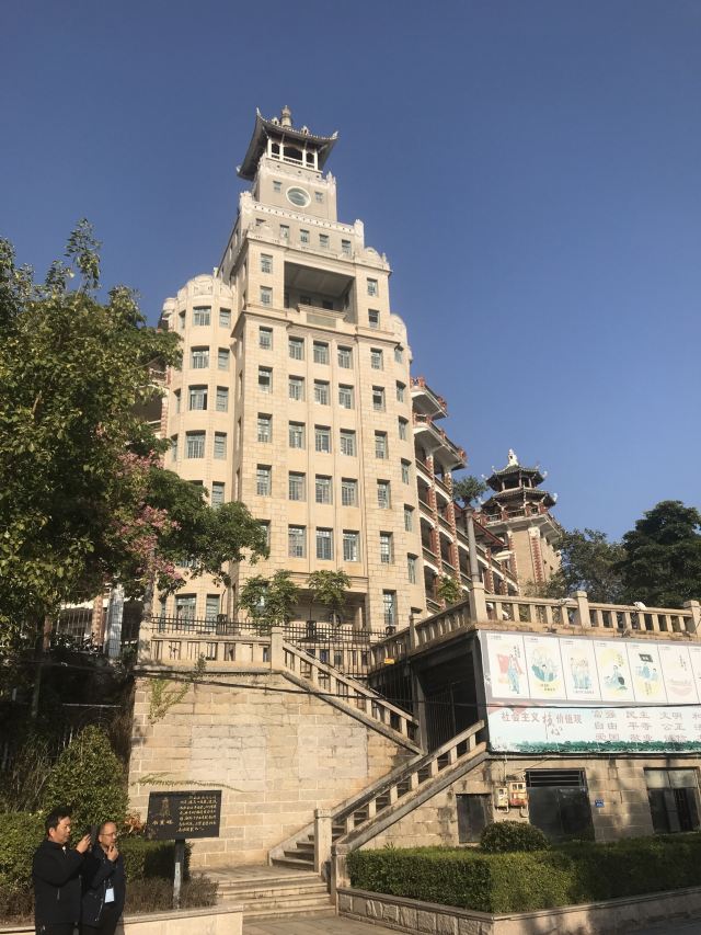 4分 满意【景色】南薰楼由主楼与两侧附楼组成。呈Y字型,主楼高十五层的西式建筑。屋顶为中式方亭。塔楼顶部有集美两字。南薰楼全部由细纹花岗岩建筑,绿瓦飞檐,整个外立面非常漂亮,是集美学村的标志性建筑。
