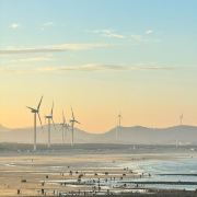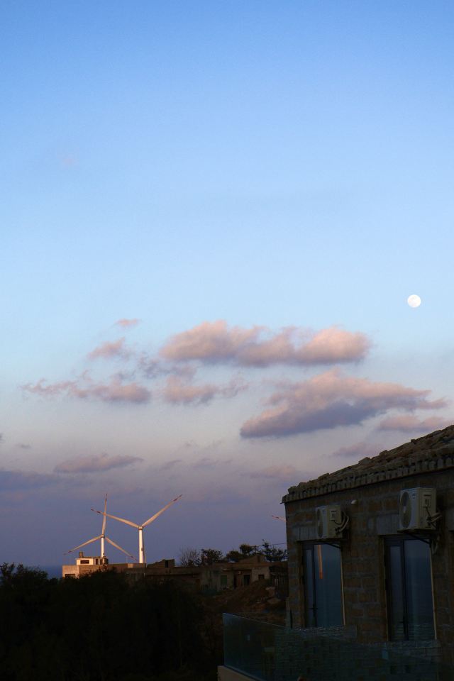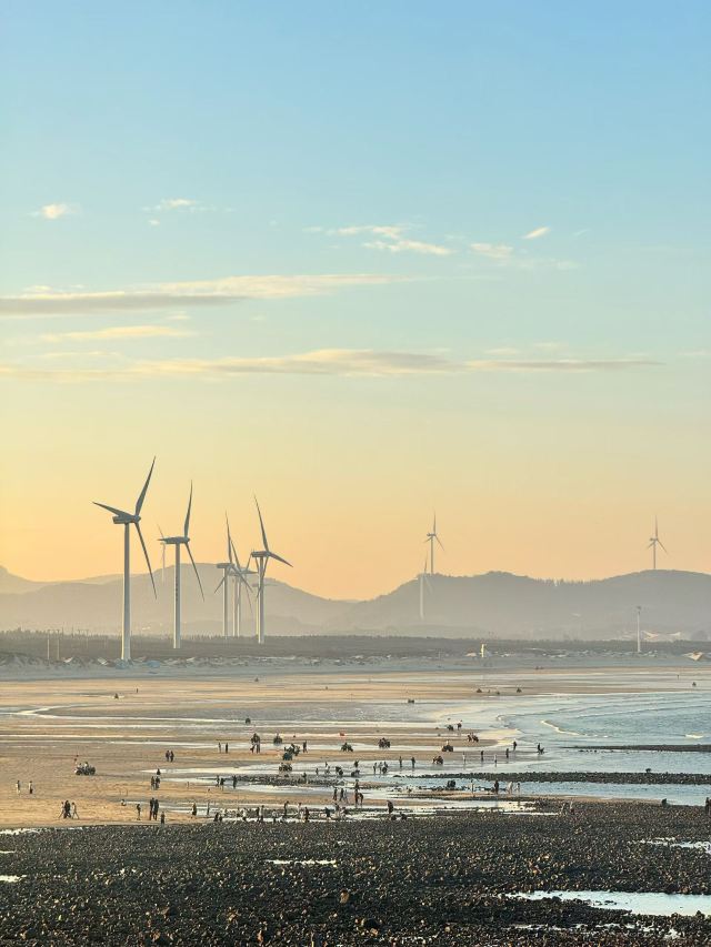 从镜沙出发,沿着环岛路继续前行,15分钟车程便闯入长江澳的风车童话。数十座洁白风车伫立在海天之间,巨大的扇叶缓慢旋转,与辽阔滩涂、蔚蓝大海构成雄浑又浪漫的画面。午后阳光正好时,风车在草坪上投下斑驳光影,骑行的身影掠过公路,与风车剪影同框,日系清新感扑面而来。待到傍晚,这里便是日落的绝佳观景地,晚霞为天空镀上粉金渐变色,风车、海面、滩涂被染成一片温暖的橘红,退潮后的沙滩化作镜面,倒映着漫天霞光与旋转的风车,随手一拍就是治愈人心的日落大片。
