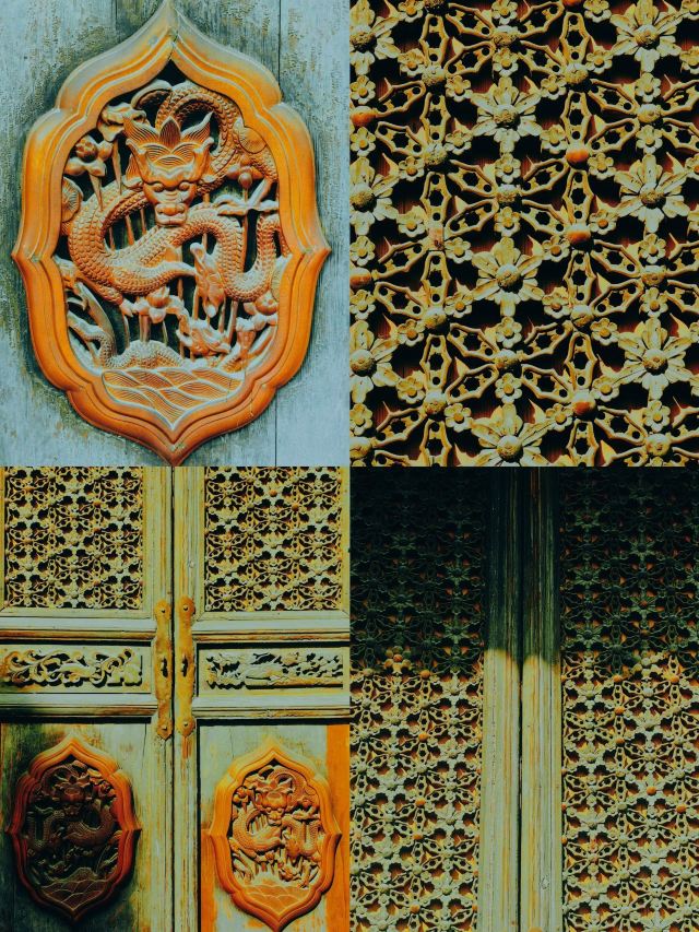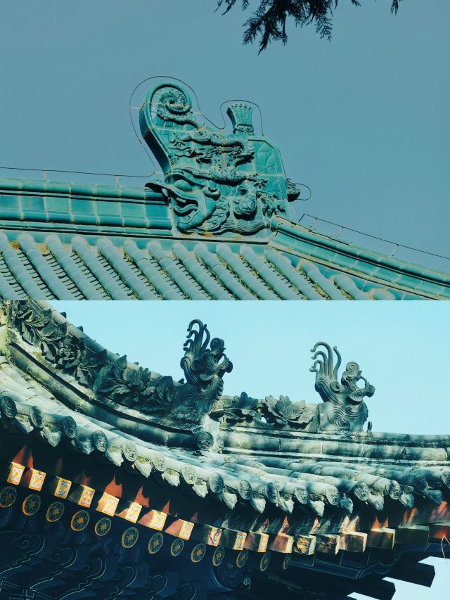 工艺精湛:庙内殿宇屋面的琉璃花脊,以及绿色琉璃瓦在阳光照耀下熠熠生辉,檐下斗拱层层出挑,前后对称,整个屋面出檐深远,建筑外观造型庄重舒展,颇为壮观。乐舞楼为重檐歇山前带歇山卷棚式屋顶,五架梁木架结构,造型轻盈华丽。大殿面阔五间,进深三间,周围环廊,单檐庑殿顶,屋面施蓝琉璃瓦,前檐格扇门窗饰精巧浮雕。城隍大殿是陕西现存等级最高的明代古建筑,其大殿是省内现存惟一的庑殿顶建筑,完整保留了明代梁架体系和木雕花饰。