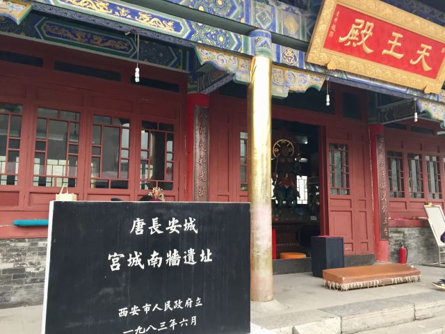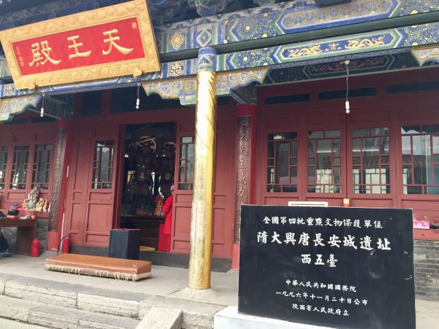 寺庙坐西向东,由山门拾级而上,一台高于一台。从山门进入,过天王殿,第一台为降龙观音殿,台前建有韦驮殿,殿前立有“唐长安城宫城南墙遗址”石碑。一台与二台之间建有宏伟的大雄宝殿。第二台称五大菩萨殿,主要供奉弥勒菩萨、观音菩萨、地藏菩萨、文殊菩萨、普贤菩萨。