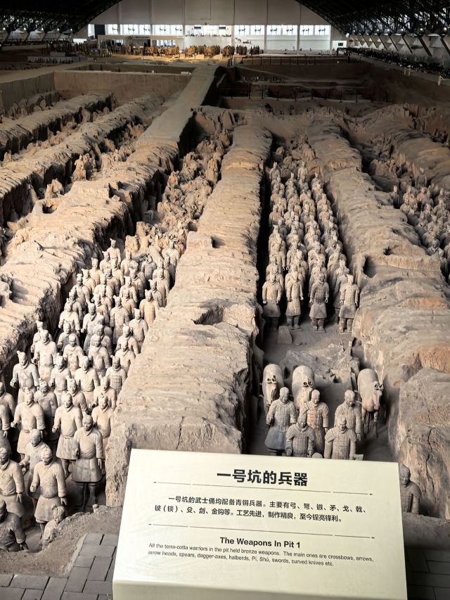 兵马俑的塑造,是以现实生活为基础而创作,艺术手法细腻,陶俑装束、神态各异,具有鲜明的个性和强烈的时代特征。俑坑内出土的青铜兵器有剑、铍、矛、戈、戟、殳、弩机以及大量的箭镞等,大部分兵器历经两千多年依然锋刃锐利,表明当时已经有了很高的冶金技术。