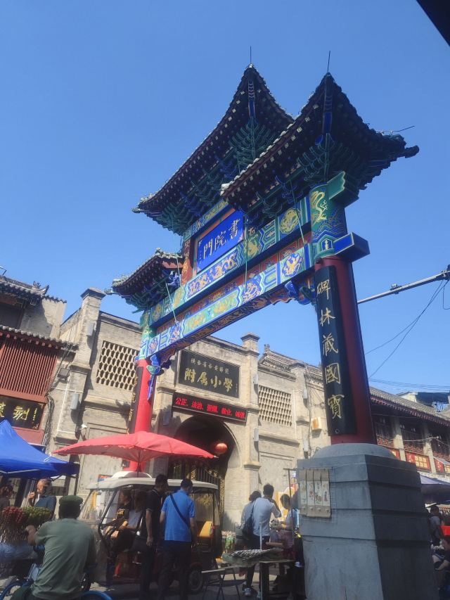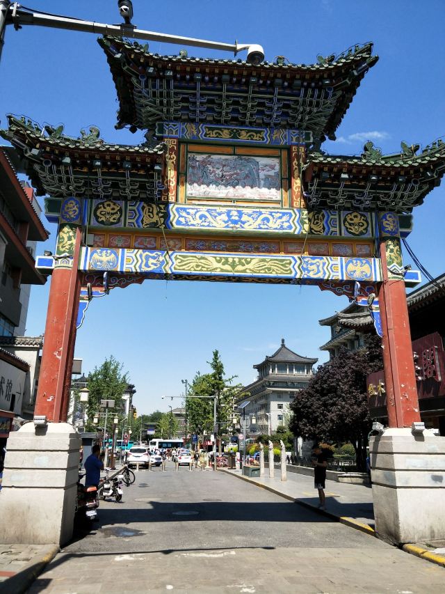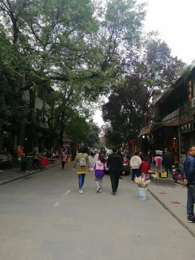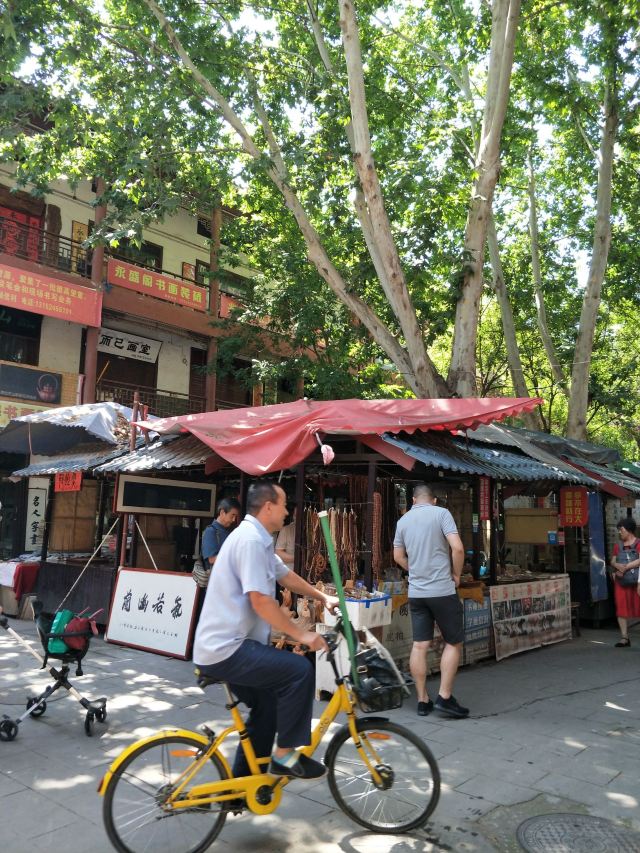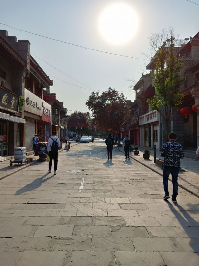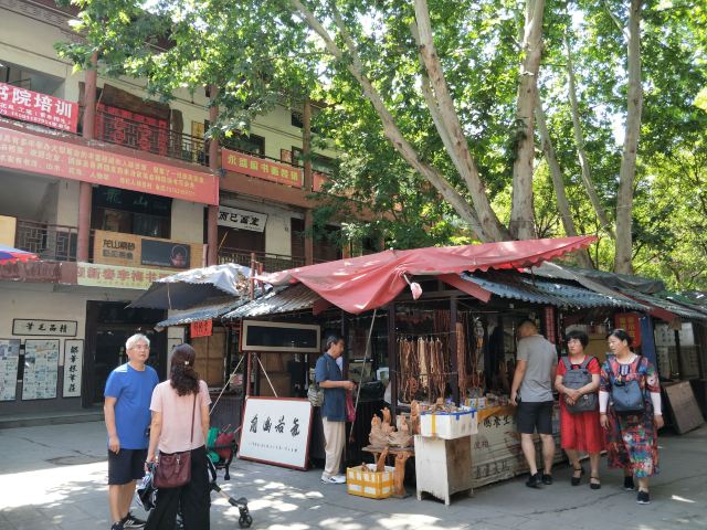 当你从南大街拐到这条街上,会感到忽然间安静了下来,街道两旁是青一色仿古建筑,脚下是青石板铺路,处处都是高大的槐树。只有五百多米的街道上,集中了上百家店铺,销售着全国各大旅游景点都在卖的“纪念品”。