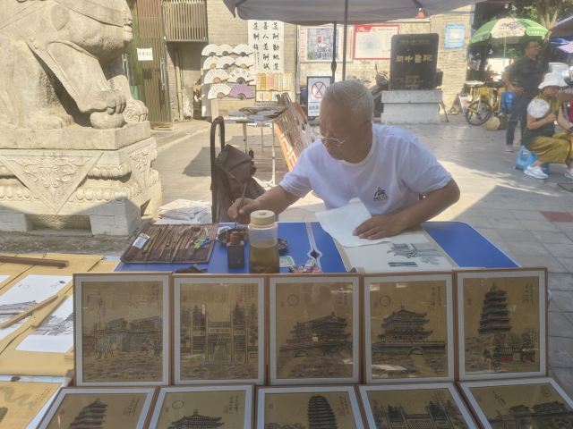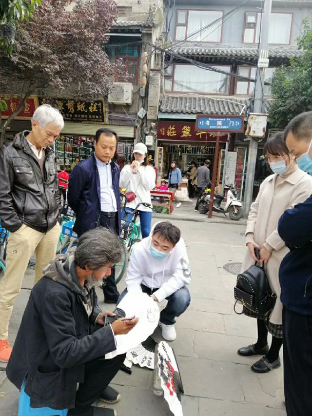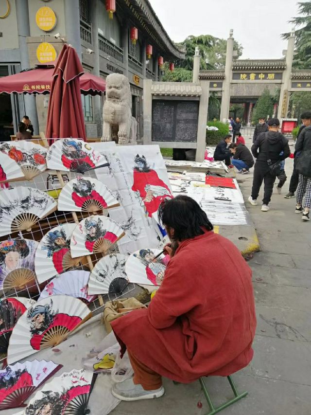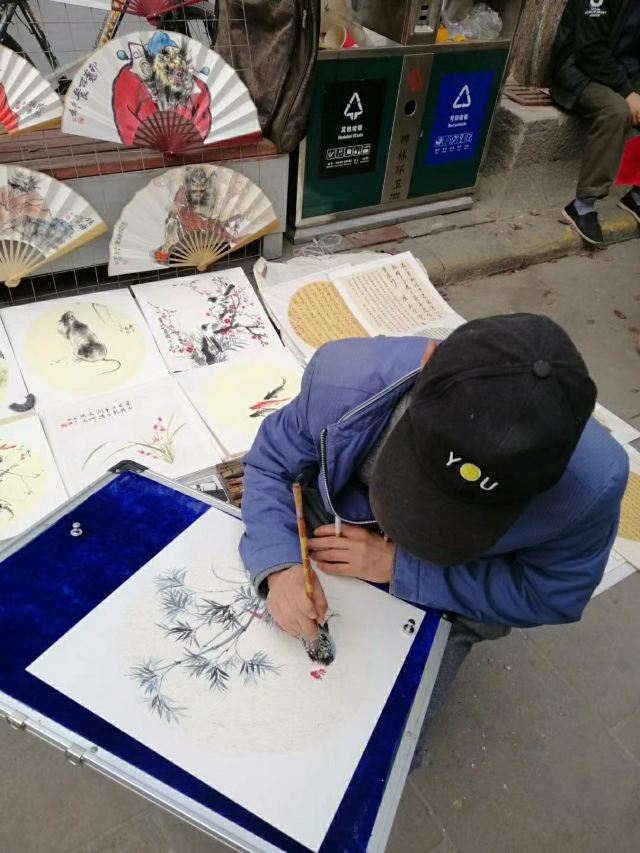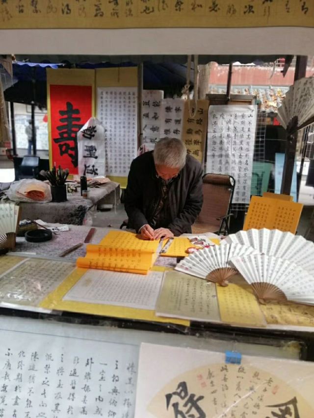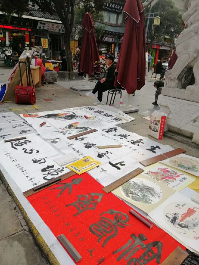 与国内其他的商业步行街相比,这里卖字画的店铺特别多,里面不仅有许多民间书画爱好者的作品,也有不少名家名作(但是也有不少赝品)。还有许多临街摆设的摊位,其实就是张书桌,主人就在此写字、作画,其中不乏高手。对于他们来说,售卖的同时,可能更享受与同门友人互相切磋技艺的过程。