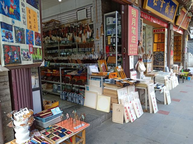 挥毫作画离不了笔墨纸砚,这里有专门经营文房四宝的小店,可以购买到上好的宣纸,精制的墨砚等等。街上还有不少民间工艺品小店,碑帖拓片、古老的乐器“埙“、本地特色剪纸和皮影,样样齐全。