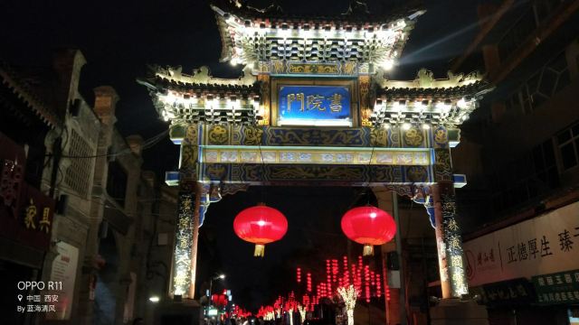 书院门步行街,位于古城南城门(永宁门)东侧,西面连着南大街,向东的尽头靠近西安碑林博物馆。明、清两代陕西的学府“关中书院”就位于这条街上。古色古色的街道旁,处处都是字画店铺和经营文房四宝的小店。