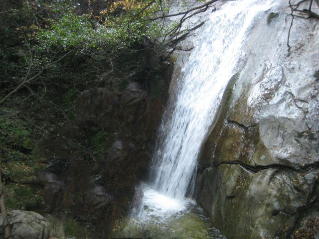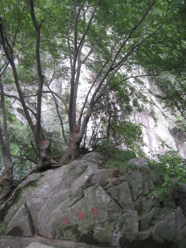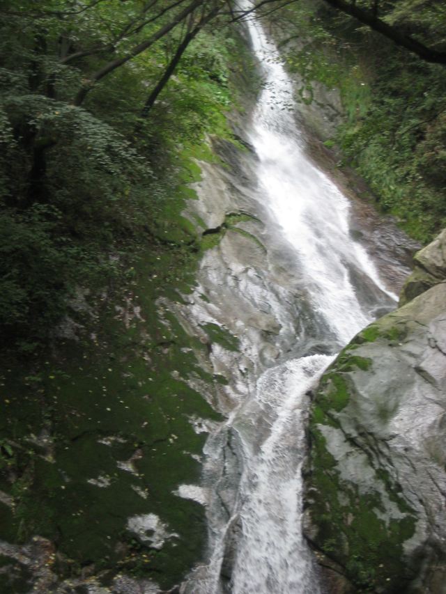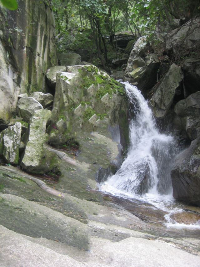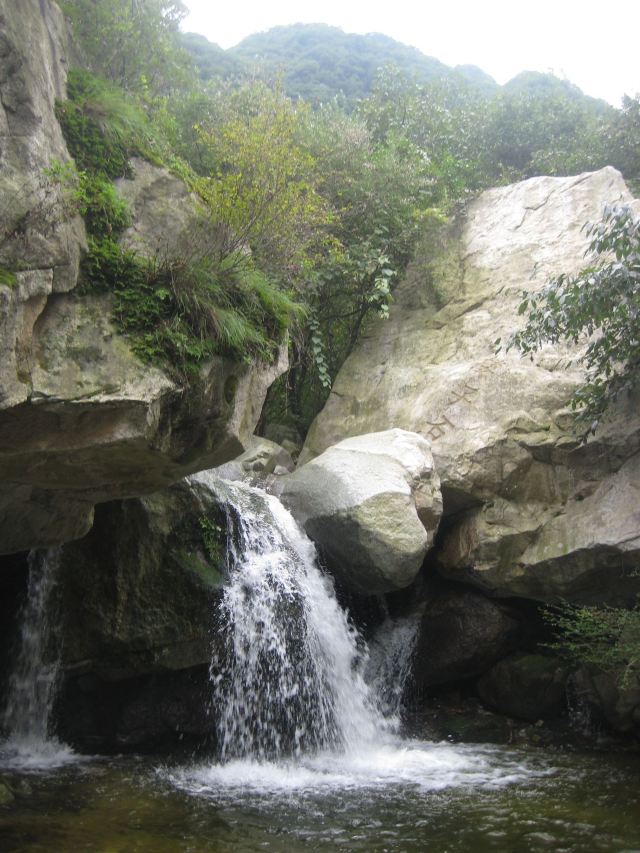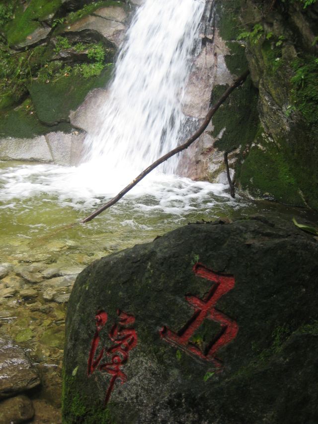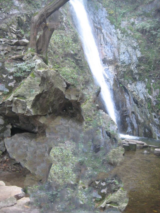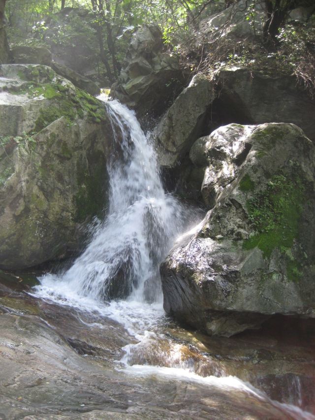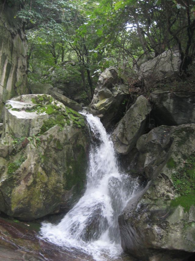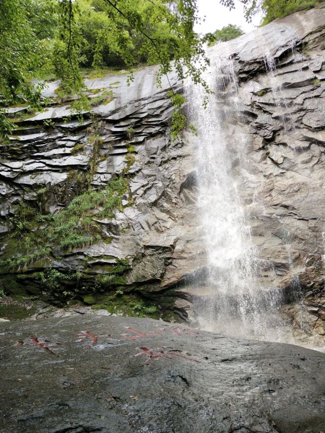 顺着山泉往上爬,先是到了“寄闲潭”,潭水清澈见底,山泉落下溅起的水花,像珍珠一样往上蹦,好看极了。再往上到“回龙潭”,瀑布就像一条巨龙从天而降,太壮观了。