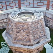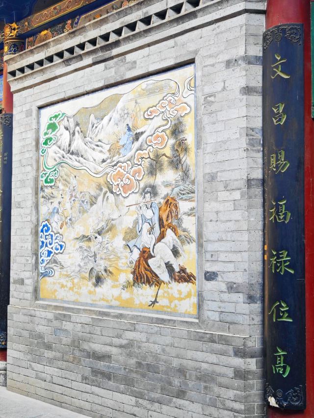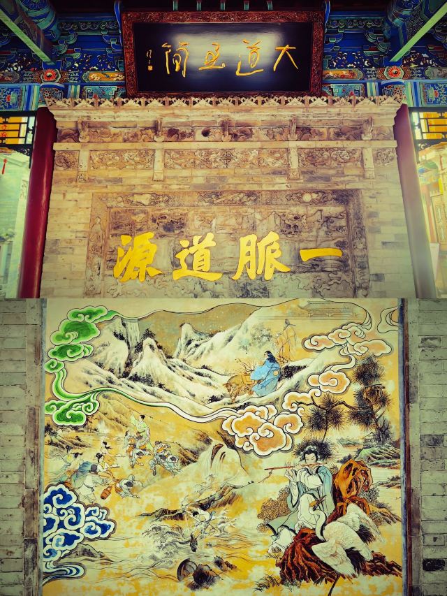 湘祖殿:仙凡交融的信仰核心主殿供奉韩湘子塑像,青袍玉箫、眉目含笑,两侧分列文昌帝君(掌文运)、关圣帝君(司财)、慈航真人(佛教观音道教化形)、药王孙思邈,体现“三教圆融”的民间信仰特色。殿内壁画《微妙玄通图》以水墨勾勒湘子渡妻、蓝关救叔等传说,梁枋彩绘“暗八仙”法器,藻井中央太极阴阳鱼旋转不息,隐喻“道生万物”的宇宙观。